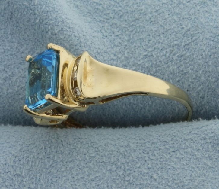 In 10k yellow gold. Center stone is a natural 8x6mm emerald cut Swiss blue topaz gemstone with bright blue color and excellent clarity. Also contains six high quality .01ct diamonds, SI clarity/I color. Size 7 1/2. 2.9g.