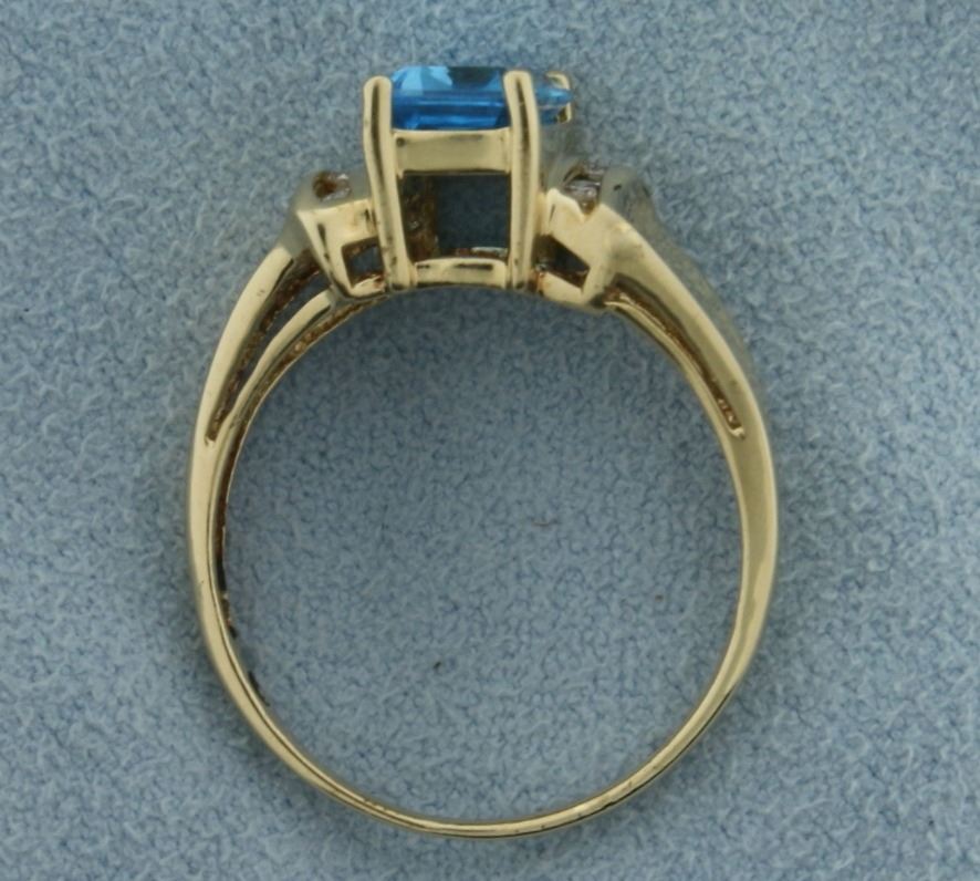 In 10k yellow gold. Center stone is a natural 8x6mm emerald cut Swiss blue topaz gemstone with bright blue color and excellent clarity. Also contains six high quality .01ct diamonds, SI clarity/I color. Size 7 1/2. 2.9g.