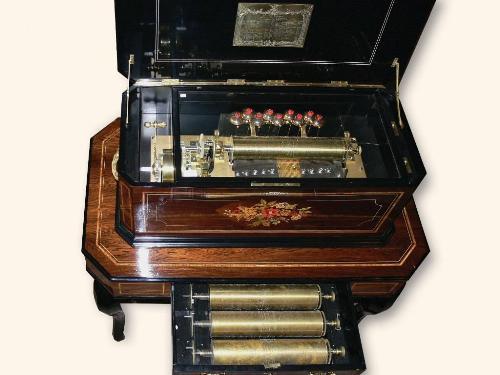 Swiss Cylinder Musical Box with 6 interchangeable cylinders on matching table, with 19 reeds and 9 bells, original tune-sheet made of brass, completely restaured. 47in wide, 44in high, 27in deep. Very rare with the large diameter cylinders. A museum's piece. The best musical table in the last 20 years.