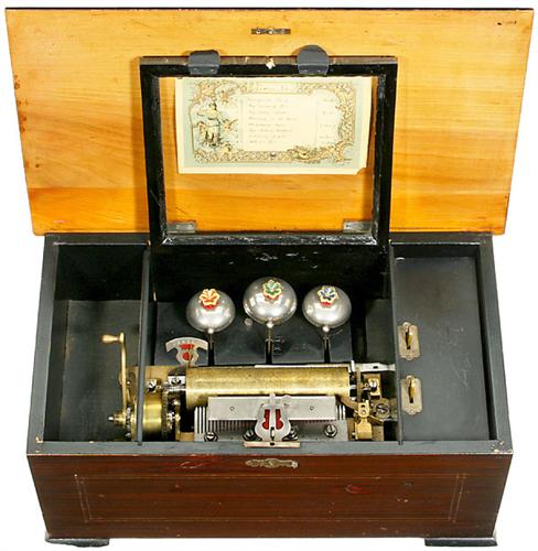 Schweizer Walzenspieldose mit Glocken Unbezeichnet, Messingwalze für 8 Melodien, 42 Töne im Stahlkamm (komplett), 3 Glocken, mit schaltbarer Zither, Holzgehäuse mit Original-Melodienzettel im Deckel. Maße: 46 x 26 x 20 cm. - Gut spielender Zustand mit sehr schönen populären Melodien!