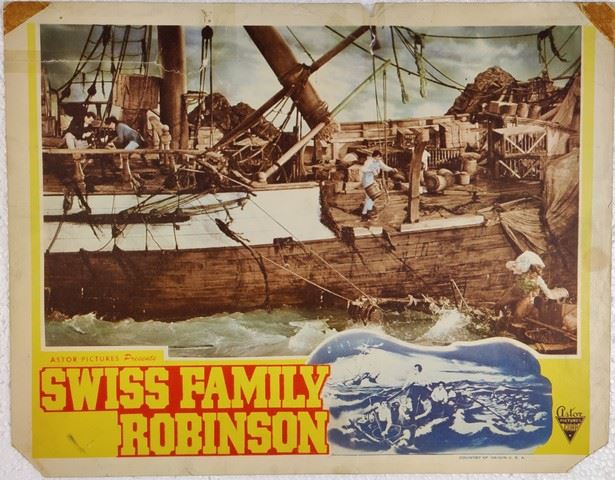 Swiss Family Robinson (The Play's The Thing Productions Inc., RKO Radio Pictures, Astor Pictures Corporation, 1940) lobby card. Adventure. Starring Thomas Mitchell, Edna Best, Freddie Bartholomew, Terry Kilburn, Tim Holt, Bobbie Quillan, Christian Rub, John Wray, Herbert Rawlinson. Directed by Edward Ludwig. Some edge wear, creases, tears, pin-holes, some stains. Fair. (11"x14").