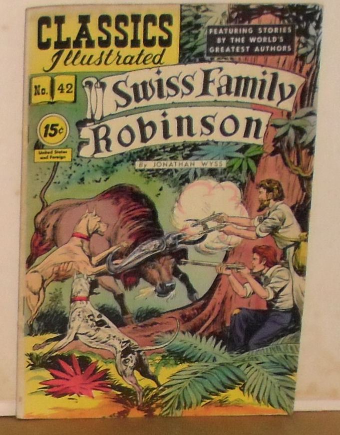 Collectible awesome 1947 Classics Illustrated #42, an 1st edition by Jonathan Wyss: Classics Illustrated comic books "Swiss Family Robinson" like in the movie story as this is a comic book with drawings; with great generous many pages makes this one thick, and wonderful gorgeous colours on each page which seem not read yet, as is... with one tiny tear on the back cover, this copy is near mint maybe; for your pleasure or collection now.