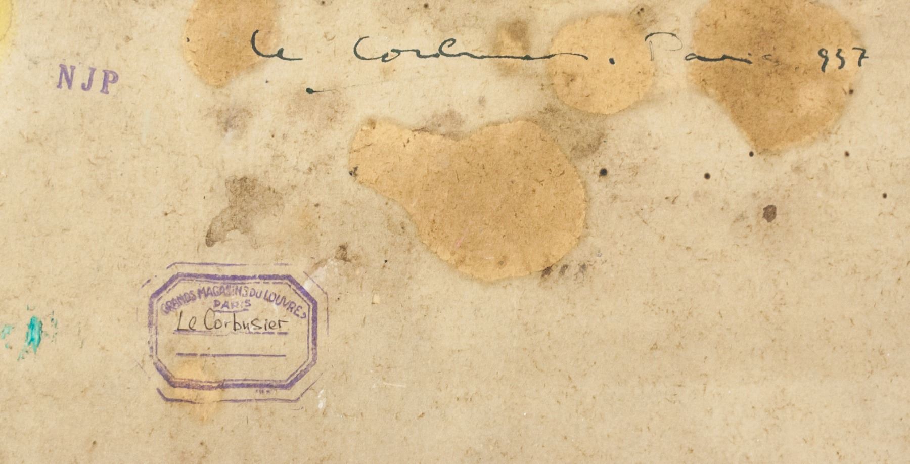 Mixed media on board. Featuring an abstract composition. Signed "Le Corbusier" to the bottom left corner. Inscribed with "Le Corbusier Paris 957" on verso. Inscribed with two stamps reading "NJP" and "GRANDS MAGASINS DU LOUVRE PARIS". 46 x 63 cm (18 x 25 in). Provenance: This lot carries limited provenance from a Southern Ontario estate