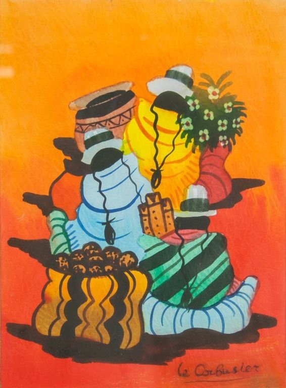 Mixed media on paper, framed. Featuring three figures in purism style. Signed "Le Corbusier" to the bottom right corner. 26 x 20 cm (10 x 8 in), Frame: 43 x 35 cm (17 x 13.5 in).
