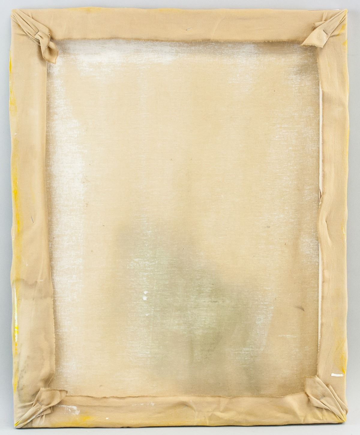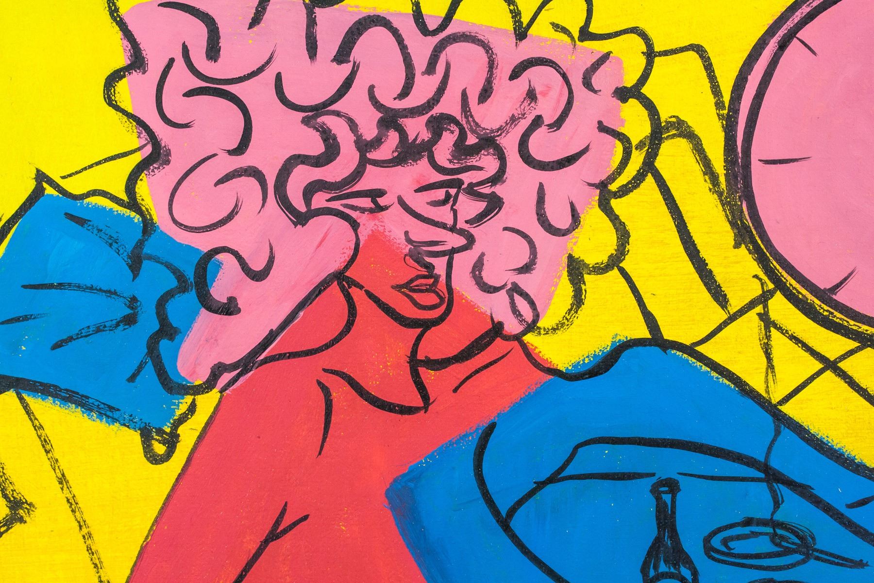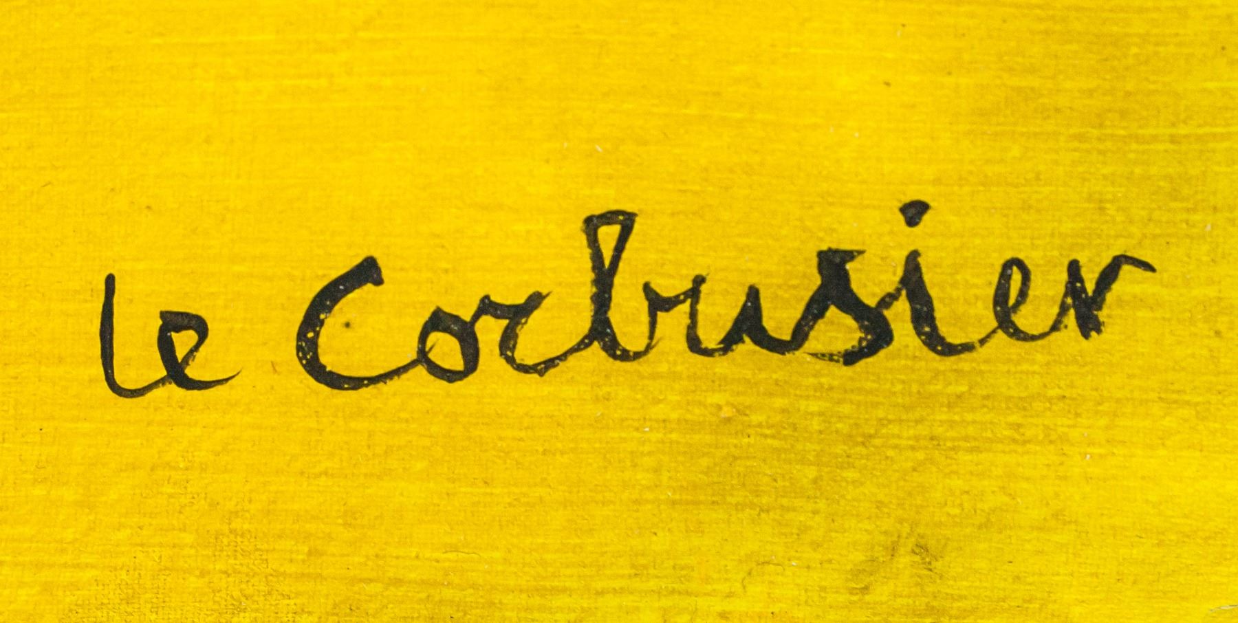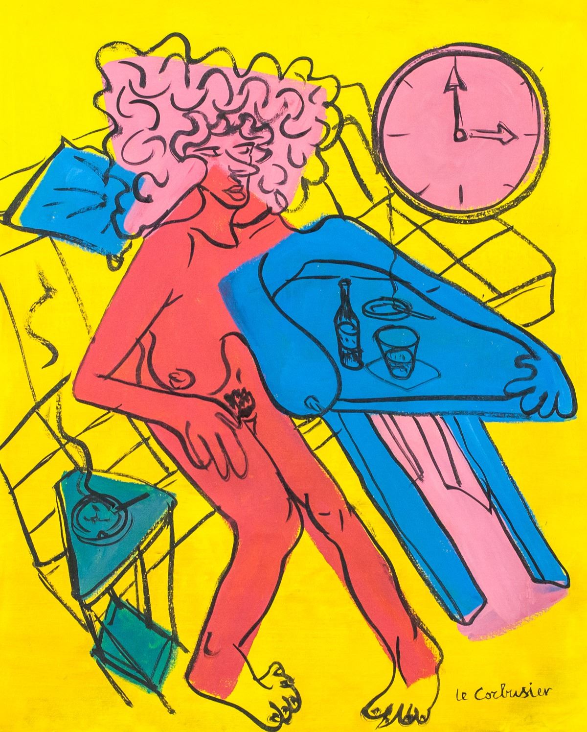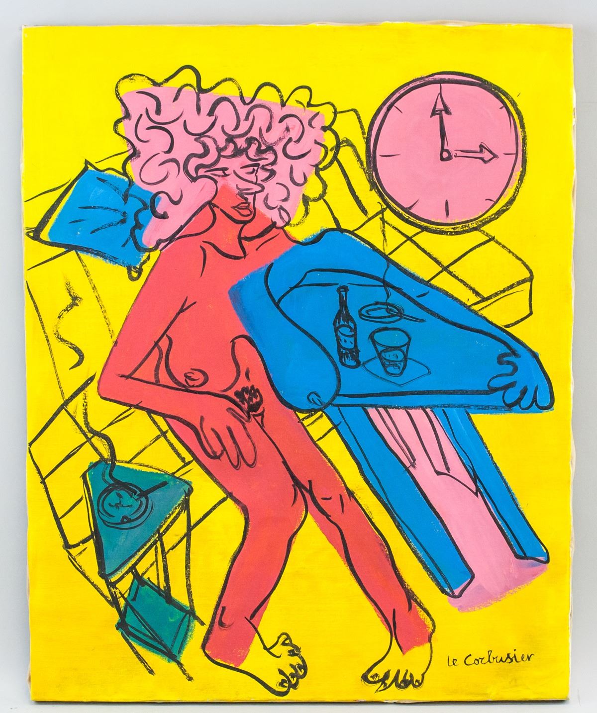 Oil on canvas. Featuring modernist composition of a woman sitting on the couch with a bottle and glass on a table beside her. Rendered in blocks of yellow, blue, and red. Signed "Le Corbusier" to the bottom right corner. 56 x 45 cm (22 x 17.75 in).