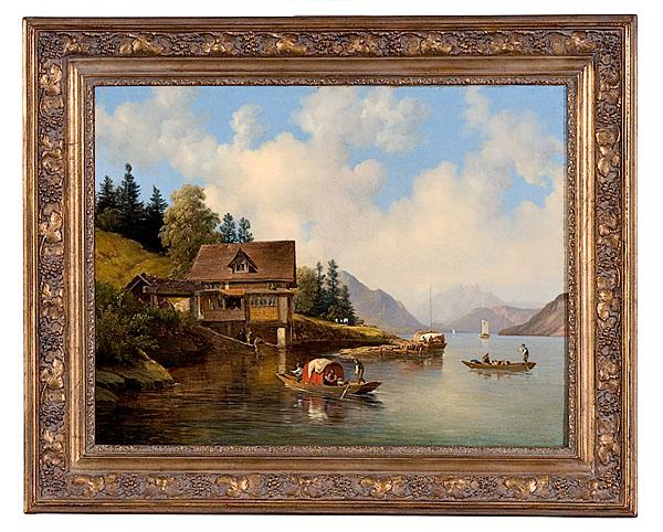 Continental, 19th century, oil on canvas, unsigned. Depicting a lakeside scene in the Alps; 25" high x 33" wide (sight).