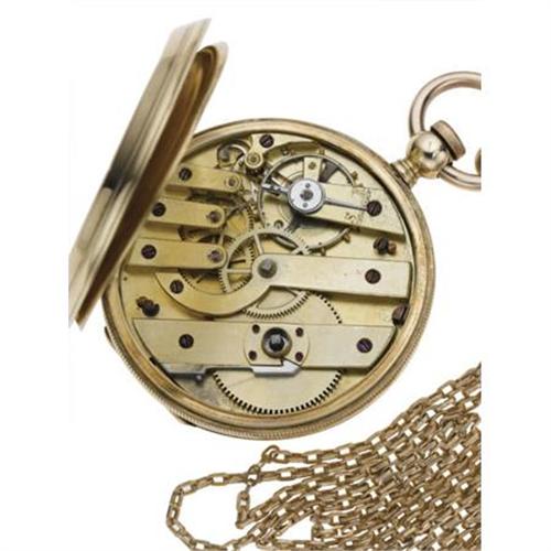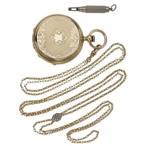 <B>Swiss Gold Hunting Case Key Wind/Set Pocket Watch with Accompanying Chain & Key</B></I> <BR><BR>Case: 48 mm, hinged, circular heavily patterned 14k yellow gold, #81671 with coin edge<BR>Dial: white porcelain with black Roman numerals, black elongated "Spade" hands and sunken auxiliary sweep seconds<BR>Movement: 37 mm, key wind/set, jeweled, marked H. Montandon Locle, patent lever, reference #81671<BR>Inside case cover is hand engraved: R. M. Cann.<BR>Notes: Watch is not in working order. Watch suspends from a gold-filled longchain, complete with turquoise and seed pearl accented slide.<BR><BR> <B>Condition Report:</B> Normal signs of wear as appropriate with age. Watch has minor denting visable along coin edge. Gross weight: 64.00 grams. Watch gears move when teased, so they are not frozen; most likely the oil has congealed. Damage to dial noted at 9 o'clock position.<BR><BR><b>Shipping:</b> Miscellaneous Collectibles, Smal (<a target="_blank" href="http://www.heritageauctions.com/common/shipping.php">view shipping information</a>)