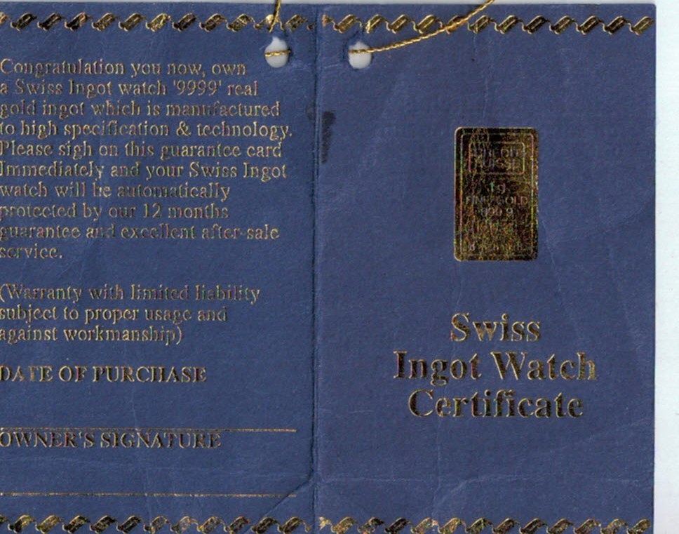 Swiss Credit Suisse First Boston Ingot watch; dial set with a 1 gram 999.9 solid gold ingot; certified replacement value $1800; certificate number 014182; Band diameter: 6.5 cm, Dial Diameter: 3.5 cm; 30 grams