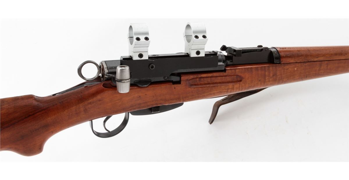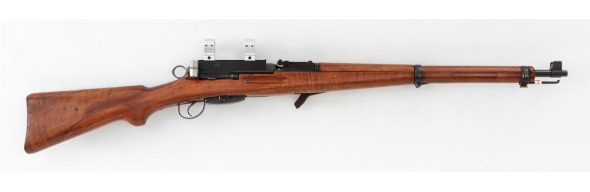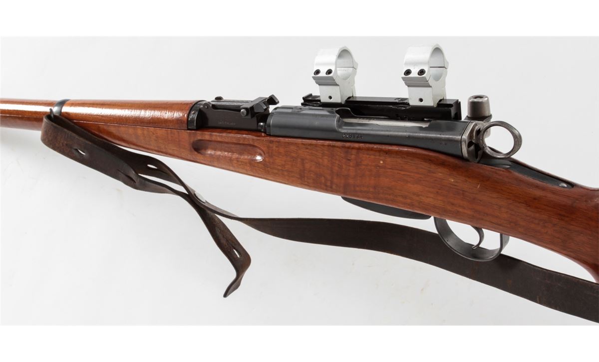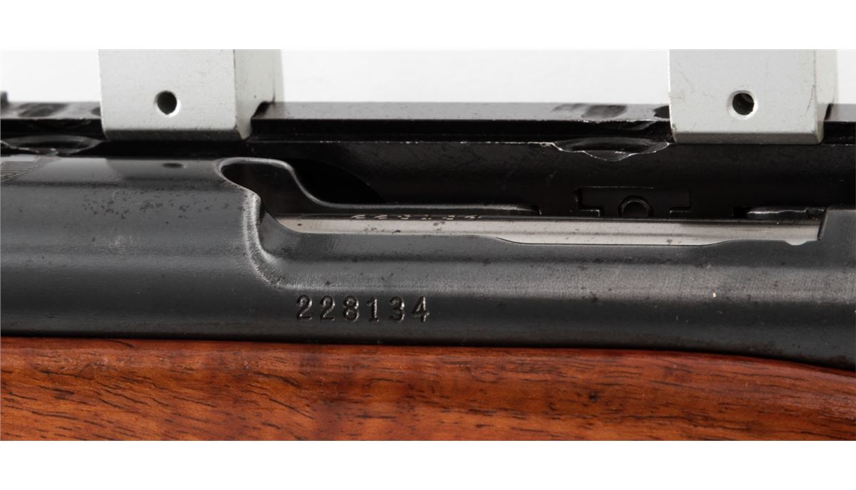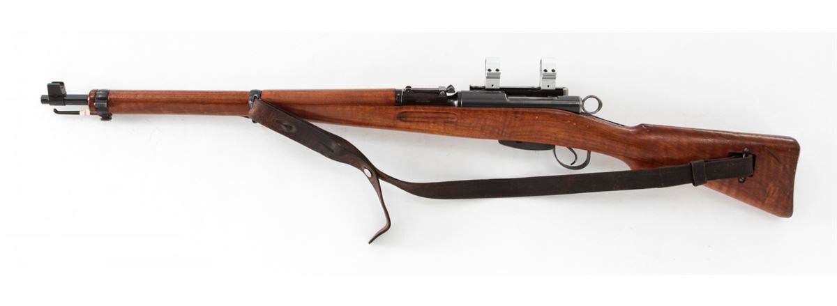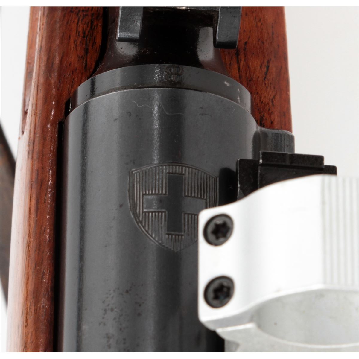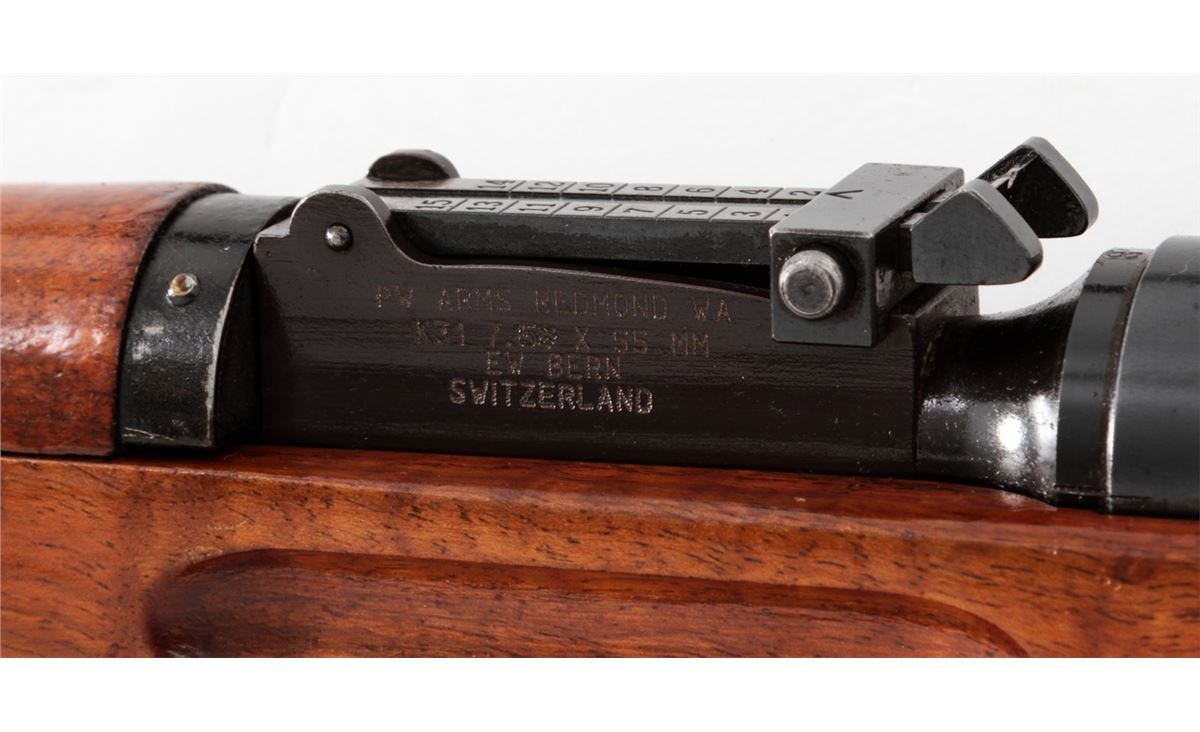 Swiss K31 Straight-Pull Rifle, #228134, 7.5x55mm, 25'' barrel, blue finish, walnut stock, with correct leather sling. Condition is fine with later added scope mount and ring. Import marked to left side of rear sight base. Stock with light scuffs and added varnish. Action is crisp, bore is fine. Est.: $250-$350. (C&R)