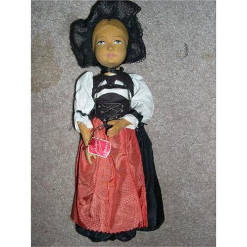 Here is a wonderful wooden doll that is 10" tall. She is jointed at the neck, shoulders, elbows, hips and knees. She is a Swiss Linden Wood Doll made in the early part of the 20th Century. These were made by various craftsmen in Brienz, Switzerland. She has hand-carved features with the hair split down the middle and forming a bun in the back. She has a wonderful face and is wearing her original regional attire. She has tacted on white socks and she wears black felt shoes. There is a red tag on her arm that says something and then Lugano. On the back it says Made in Switzerland. She is in Mint condition.