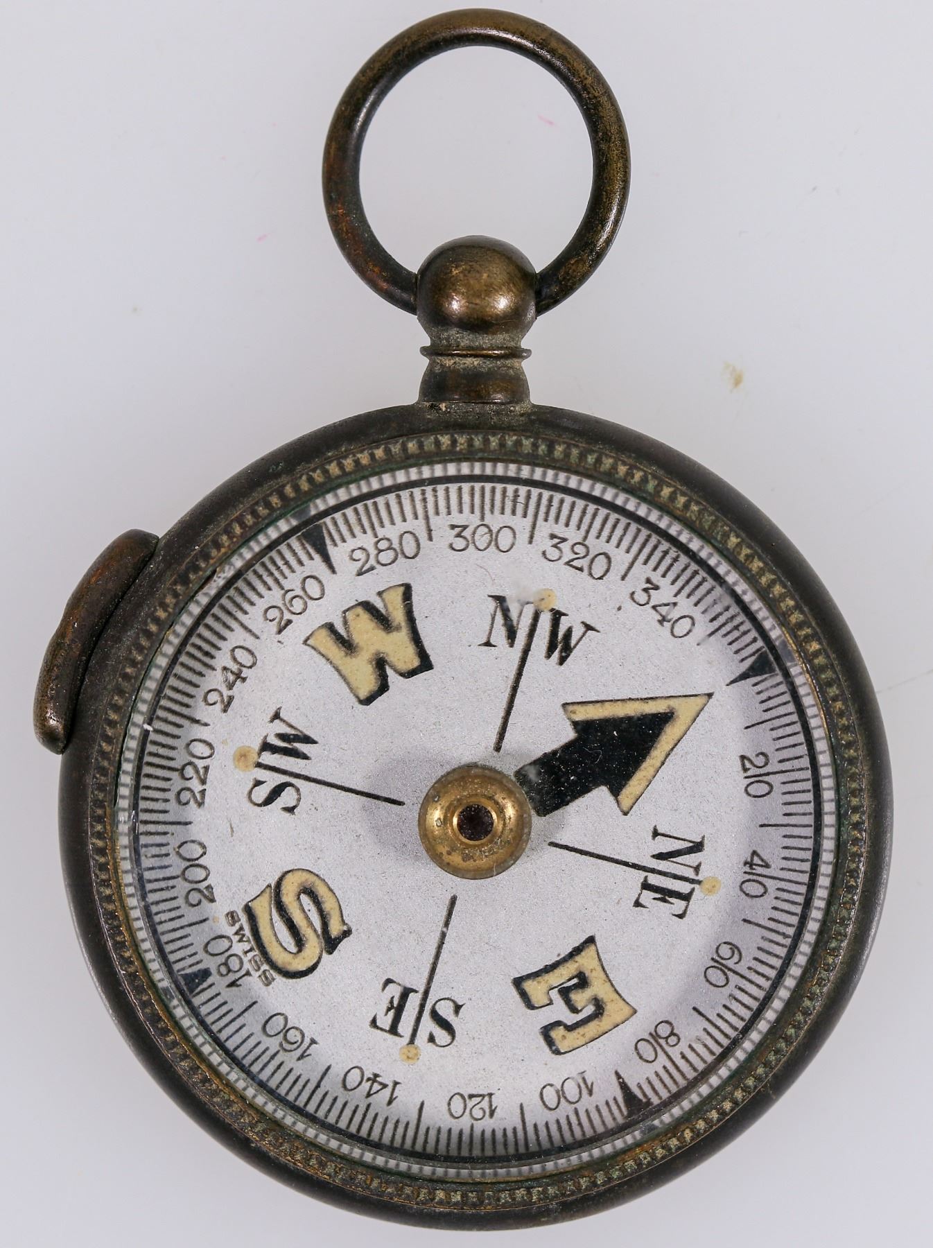 his is a Swiss made compass at 1.5 n. in diameter. Built without a cover. It has a needle stop and is still accurate. Please see photo for details.