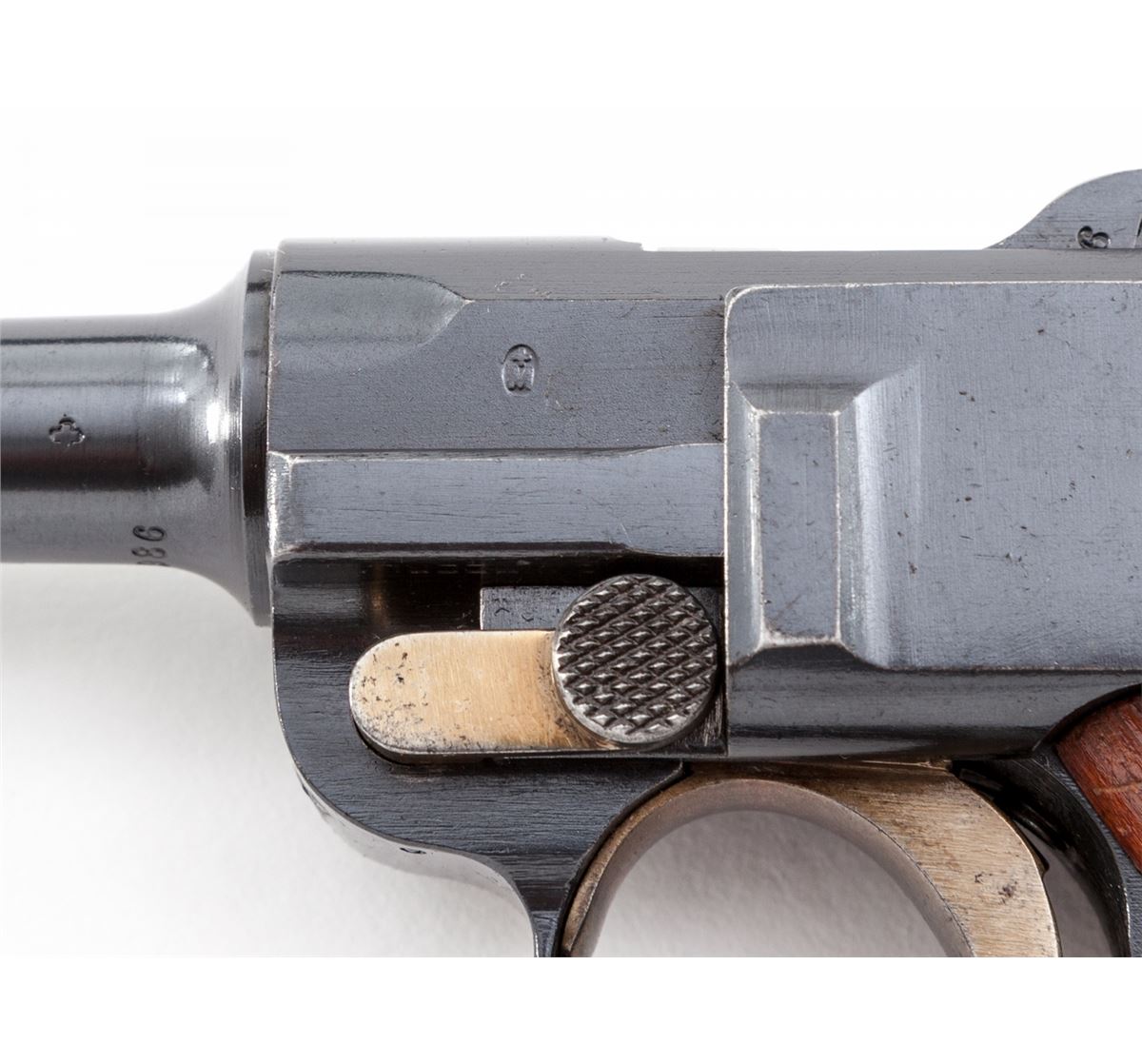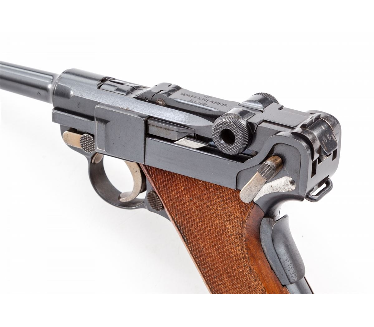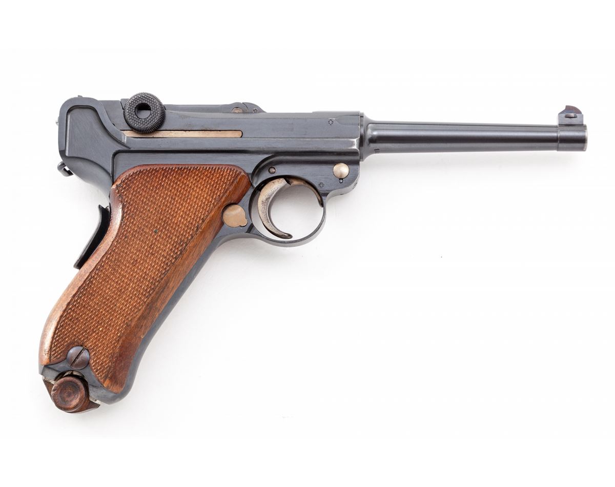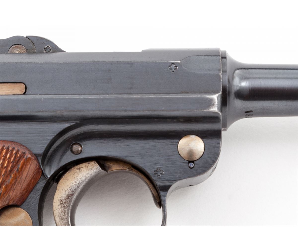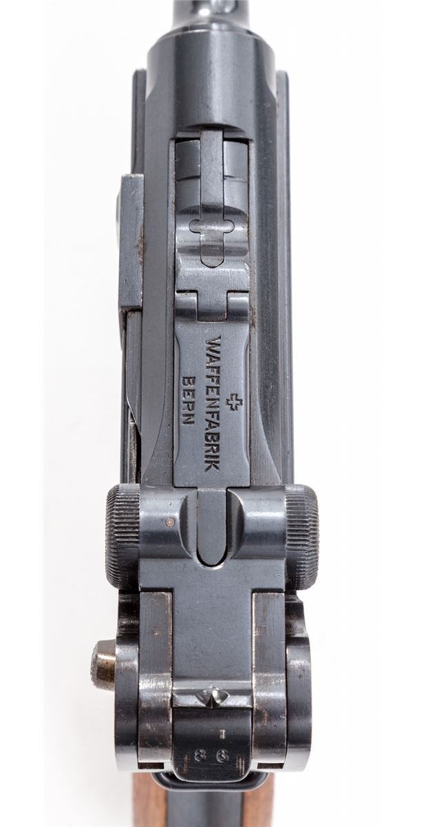 Swiss Model 06/24 Luger, #18986, .30 Luger cal., 4-3/4'' barrel, blue finish, straw small parts, checkered walnut with smooth bordered grips, with one correct unmarked wood base nickel-plated magazine. Considered uncommon with blank chamber area, toggle marked ''Waffenfabrik/Bern'', lower portion of safety area is polished bright. Condition is excellent retaining approx. 97% original blue, and additionally later marked just above triggerguard ''P43'', with very minor thinning to high edge of sideplate and at muzzle. Near imperceptibly import marked to right side bottom frame rail. Grips remain crisp. Grip screws have toned. All visible matching small parts. Action is good, bore is mirror bright. Est.: $1,800-$2,400. (C&R)