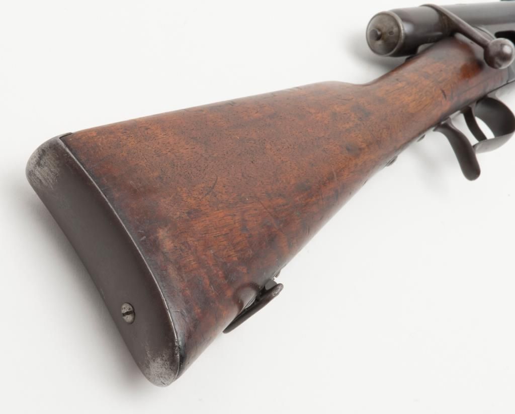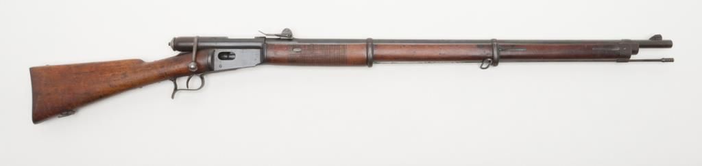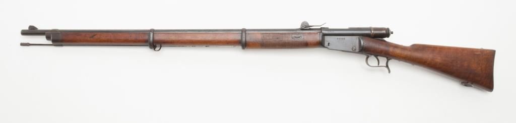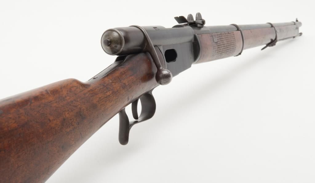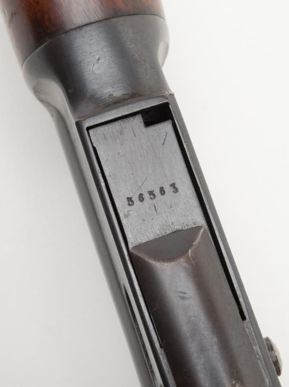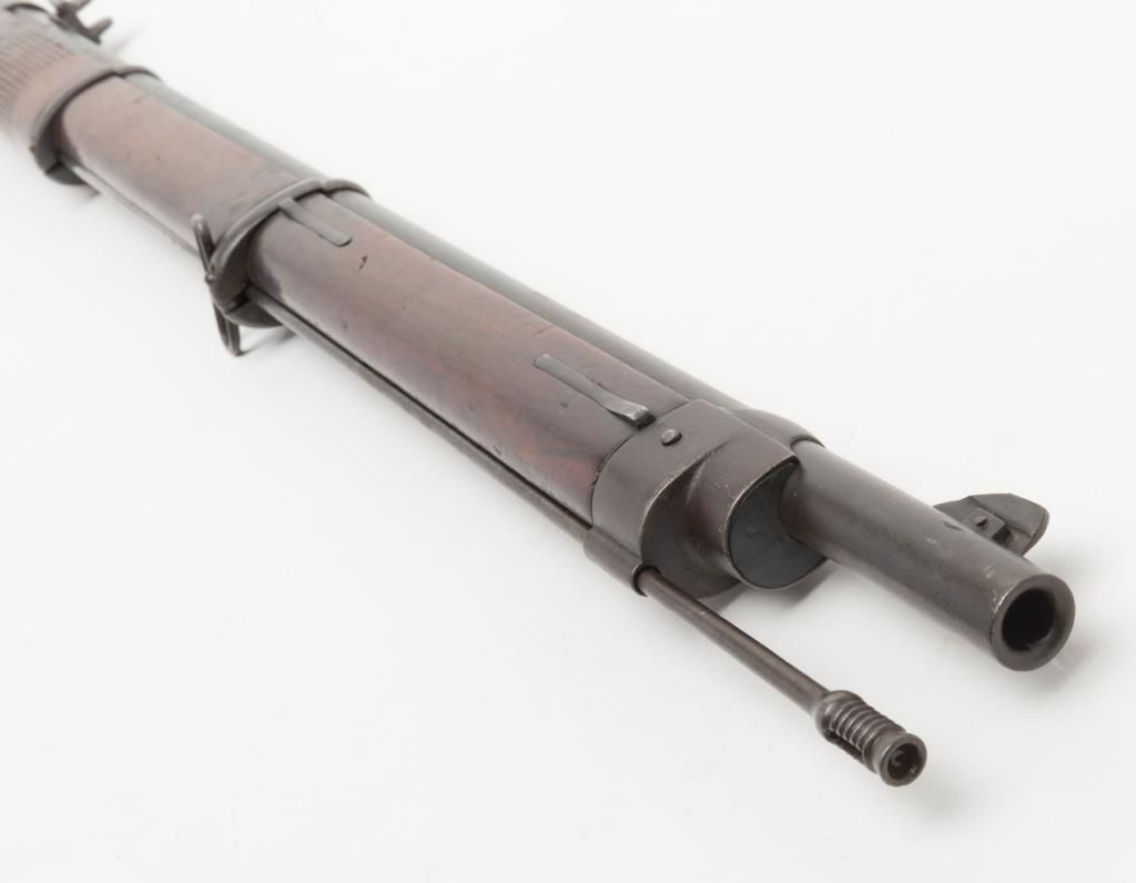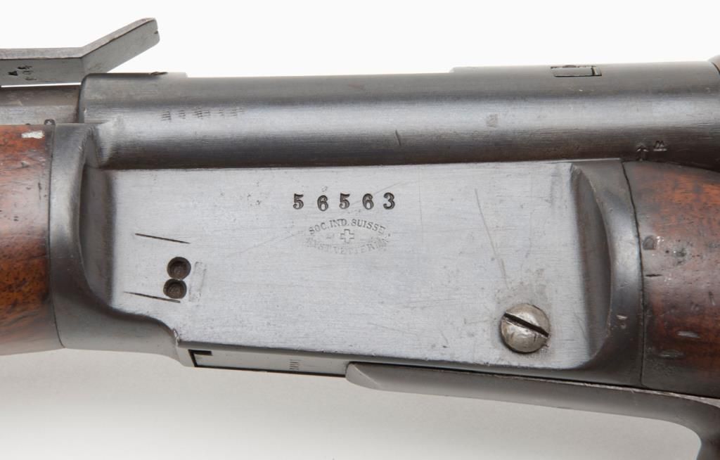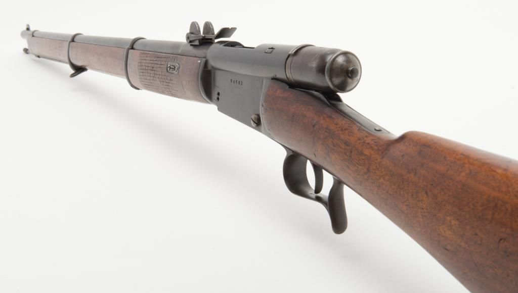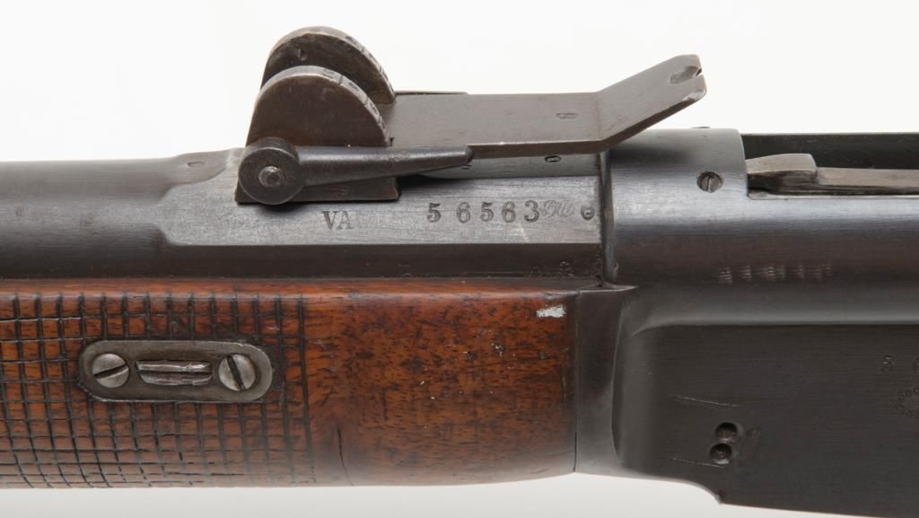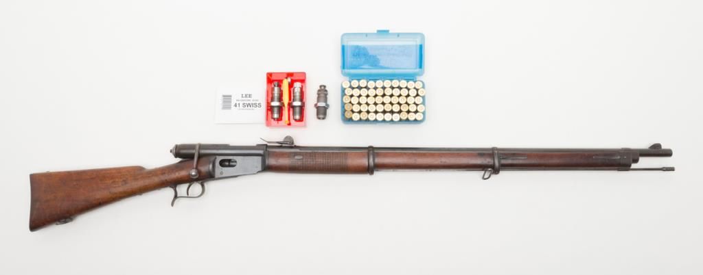 Swiss Model 1871 Vetterli bolt action rifle, .41 Swiss cal., 33” barrel, checkered full length wood stock, single trigger, steel cleaning rod under barrel, #56563 in overall very good condition showing considerable muted original blue finish,very good to fine bore, crisp action, sharp markings, very good wood stocks; accompanied by Lee .41 Swiss loading dies and 50 reloaded rounds (included as brass only). (Antique). Est.: $350-$700.