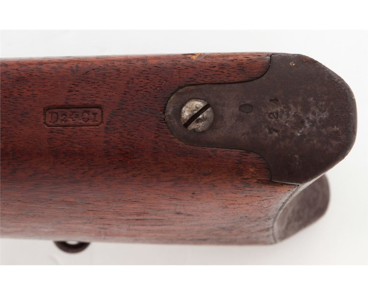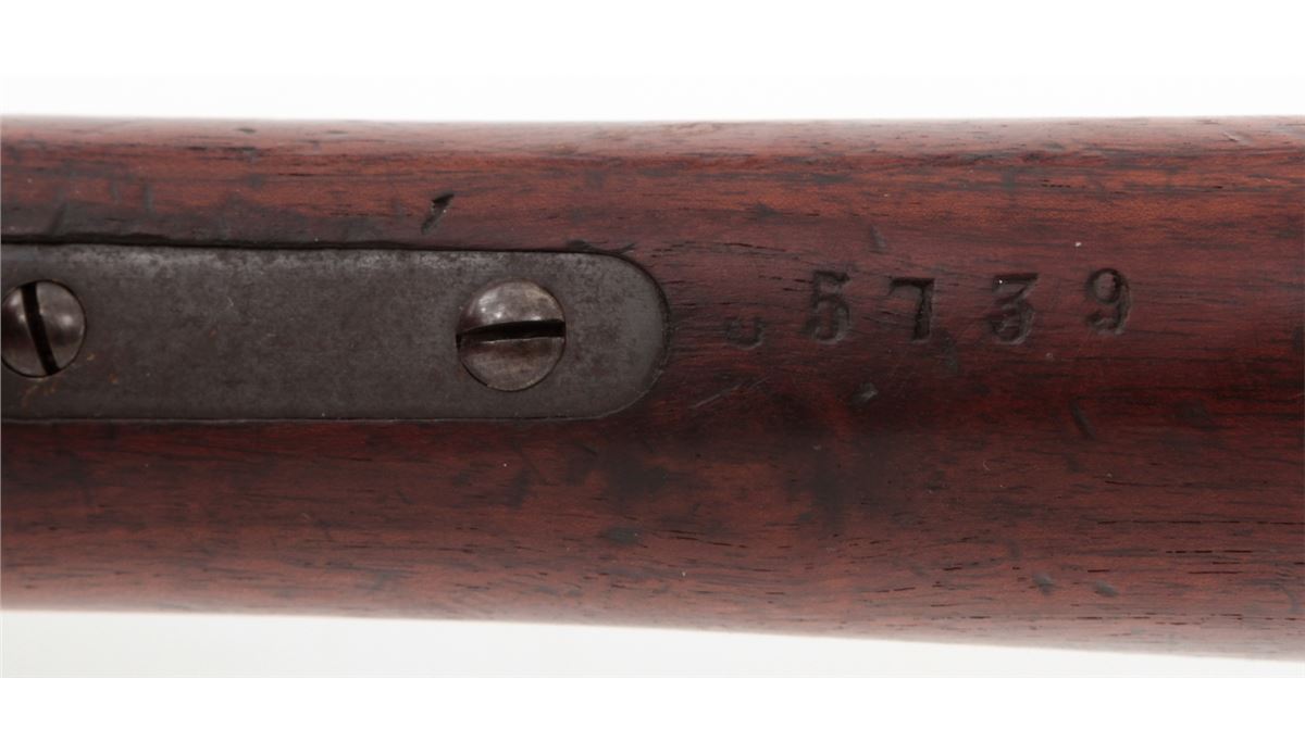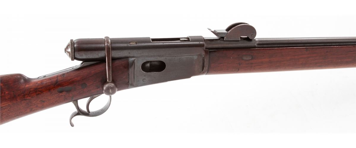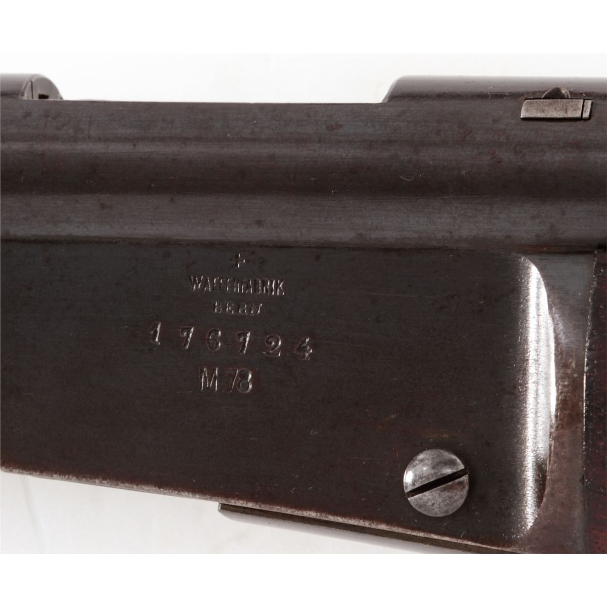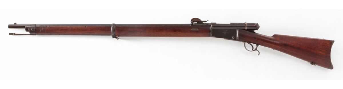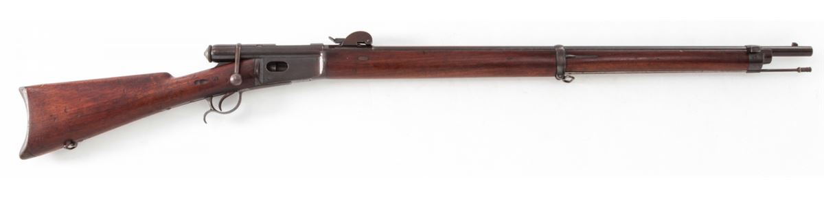 Swiss Model 1878 Bolt Action Rifle, by Waffenfabrik, Bern, #176724, 10.4x42R RF cal., 33'' barrel, blue finish, walnut buttstock and full-length forearm. Condition is very good with mild general toning to metal surfaces. Stock with bruises and scuffs. Action is crisp, bore is fine. Est.: $300-$500. (Antique)