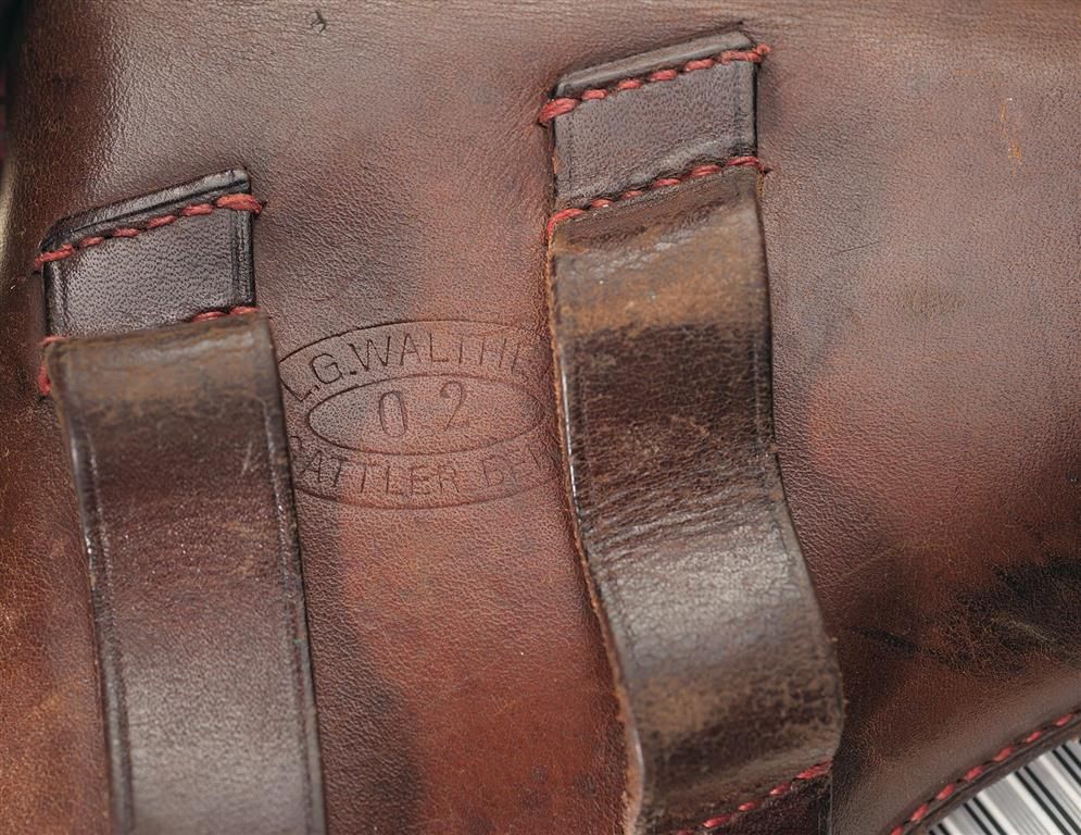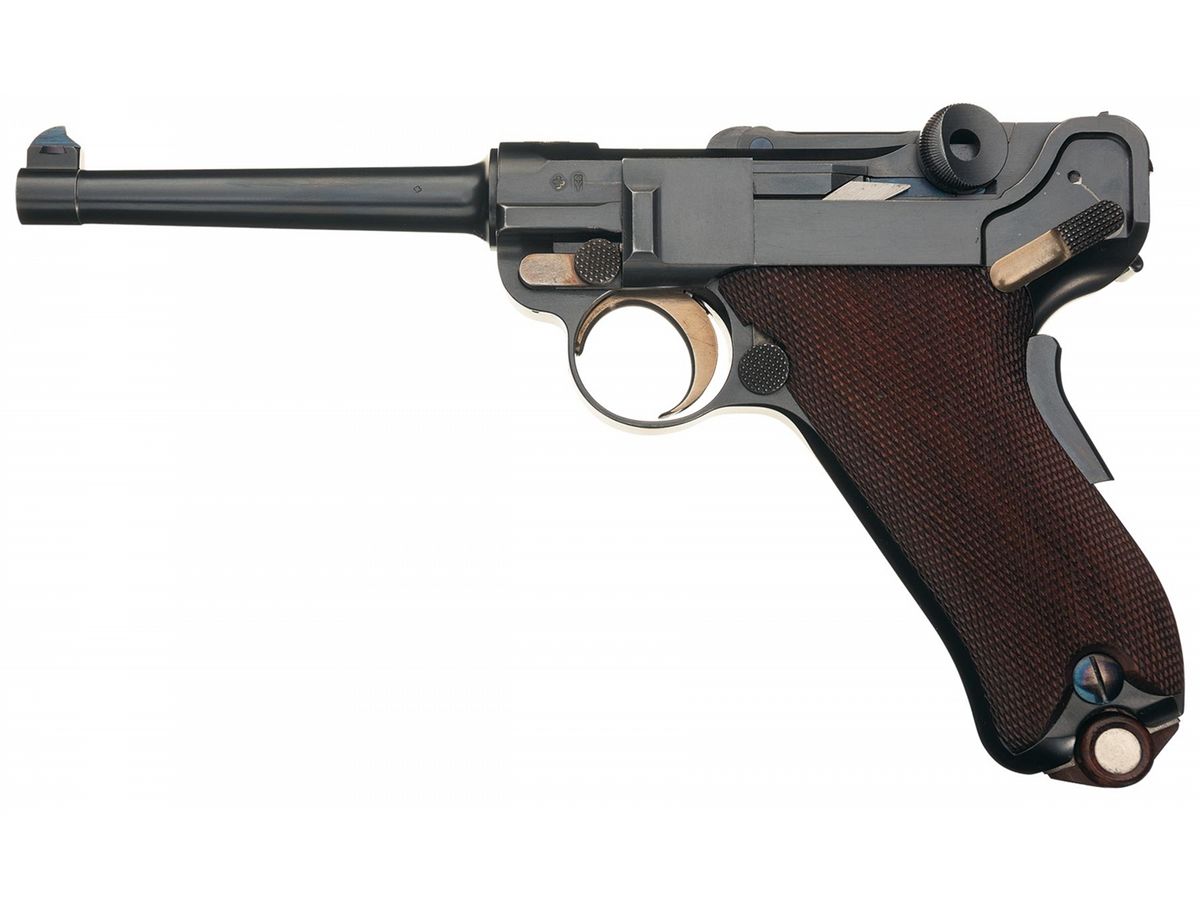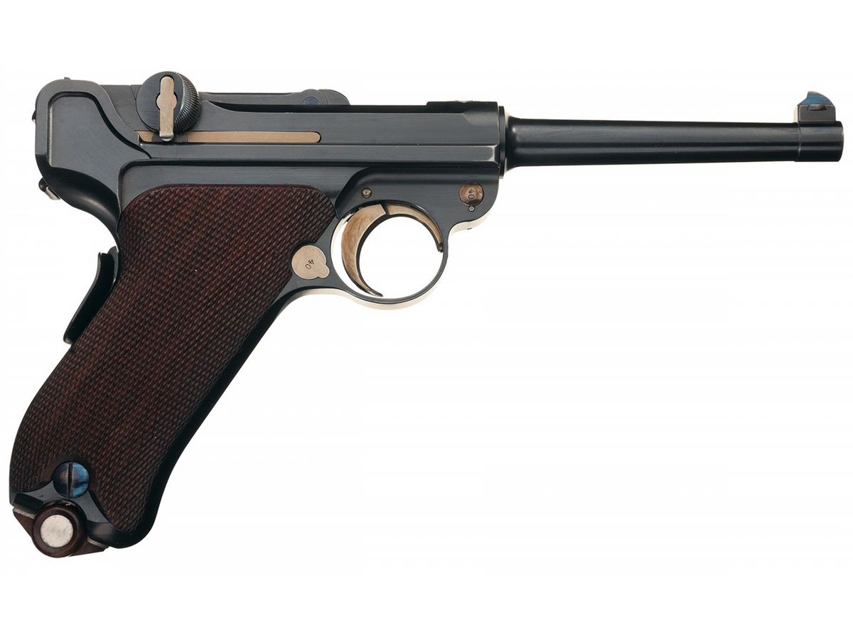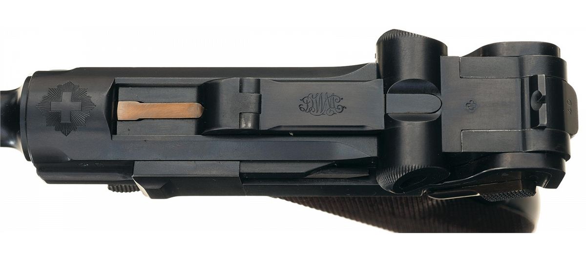 This is an example of a very early DWM Model 1900 Swiss military contract Luger. An estimated 3,000 military contract pistols were manufactured in the 2,000-5,000 serial number range. These pistols have the dished toggles with toggle lock, flat/recessed breech bolt, no stock lug, grip safety, flat mainsprings, and fast taper barrel that is 4 3/4 inches long. This pistol has the standard "Swiss Cross in Sunburst" over the chamber, and "DWM" scroll on the front toggle. The left side of the barrel extension has the standard Swiss Military Cross and Swiss control proof. Original fixed blade front sight and original "V" notch rear sight with the small Swiss Cross in front of the rear sight. It is fitted with checkered walnut grips stamped with the partial serial number (40) on the back of each grip. This Luger comes with one original unmarked Swiss nickel plated wood bottom magazine and is complete with an early 1900 Second Pattern Swiss military style leather holster and shoulder strap. The holster is stamped on the back side "L.G. WALTHER/02/SATTLER BERN". This holster is accompanied by the original shoulder straps.