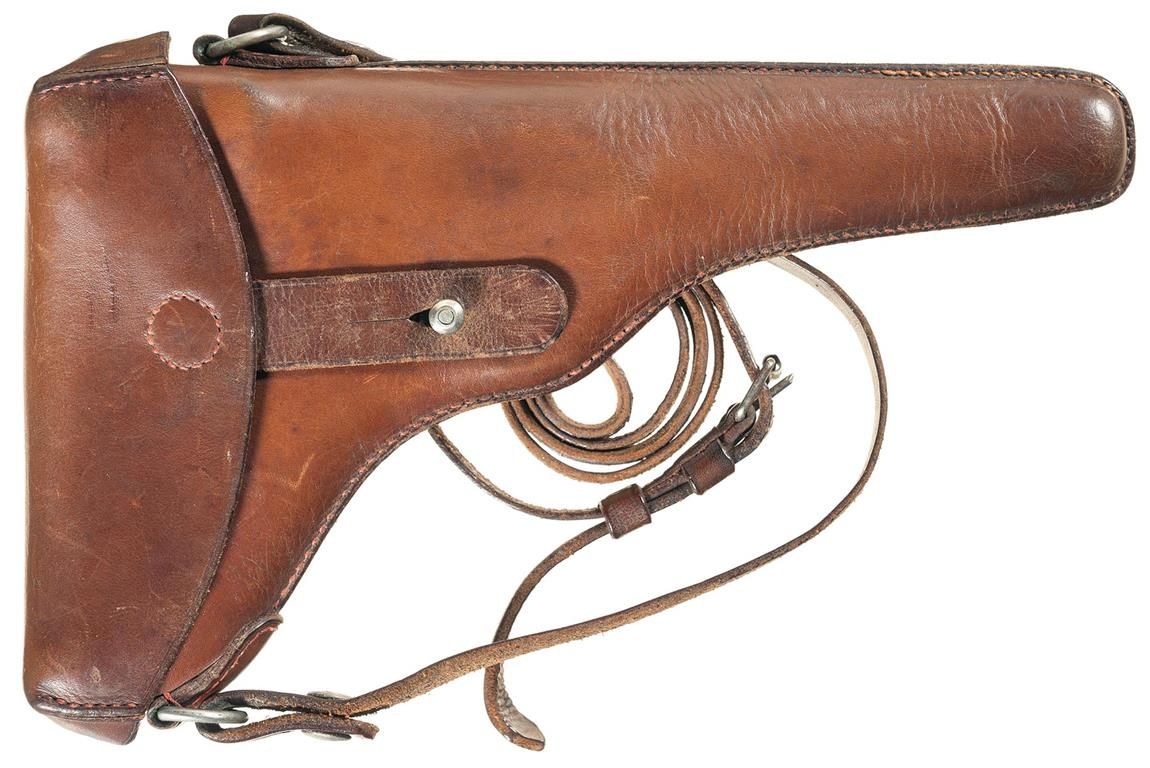 Very fine with 99% of the armory blue finish remaining overall with only very minor edge and high spot wear. The straw colored small parts retain 95% of their straw colors overall. The grips are excellent with nice distinct sharp checkering. The holster is fine with a nice even brown color, tight stitching and clear distinct markings.