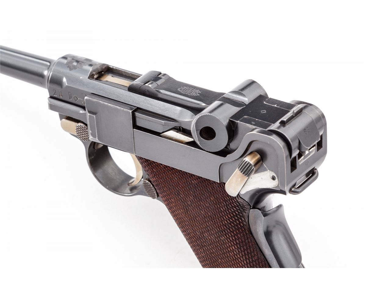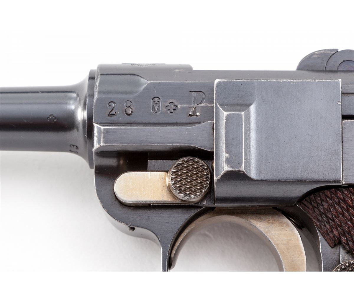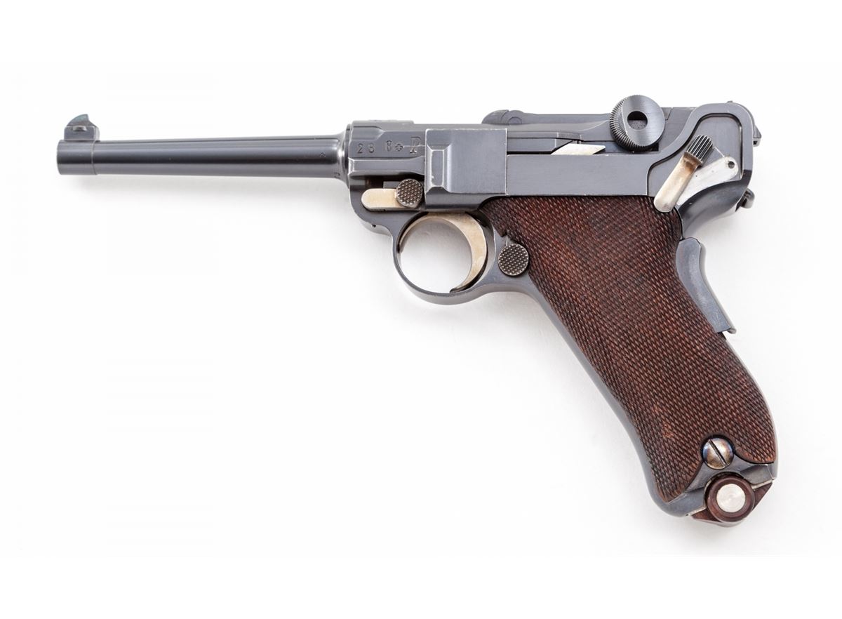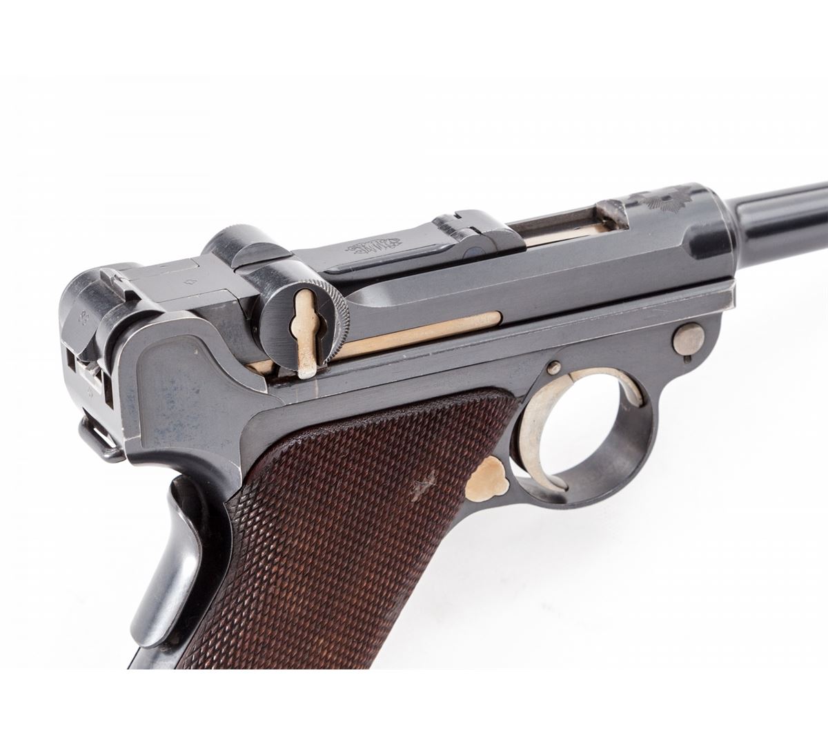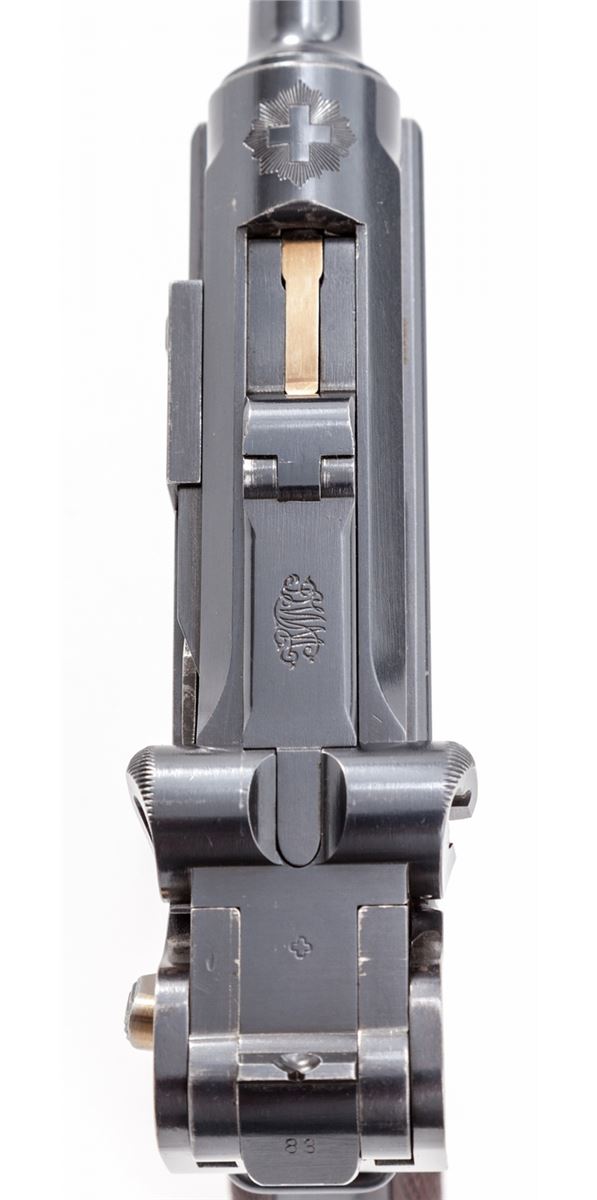 Swiss Model 1900 Military Luger, #3083, .30 Luger cal., 4-3/4'' barrel, blue finish with straw small parts, factory checkered walnut grips, one nickel-plated wood base magazine with metal inserts. Cross and sunburst inscription above chamber, DWM marked toggle, serrated thumb safety, lower portion of safety area polished bright, left side of upper receiver marked with large format ''P'' and 28, indicating that this gun was released from military service in 1928. Condition is excellent retaining approx. 97% blue with minor thinning to highpoints of sideplates, and light micro-scratching to left receiver flat and front strap. Grips remain crisp with just minor flattening and some oil darkening. All visible matching small parts. Action is good, bore is mirror bright. Est.: $3,000-$5,000. (C&R)