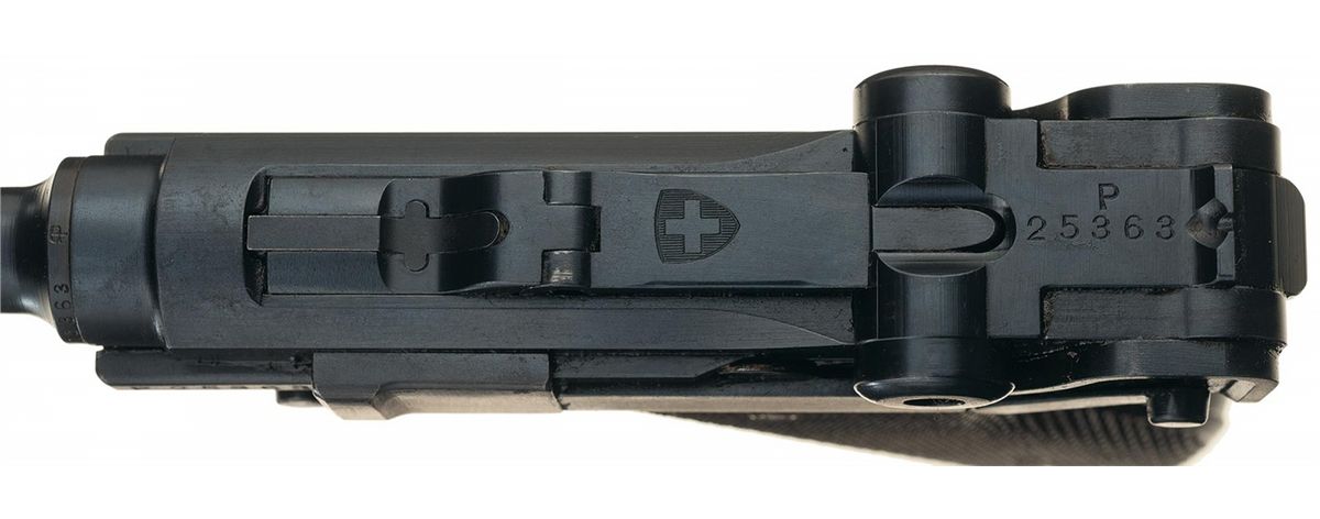 This is a nice example of an early 1929 Swiss commercial contract Luger as manufactured by the Bern factory Switzerland. These 1929 pistols were the last configuration as used by the Swiss. The top of the chamber is unmarked and the rear toggle has the "Swiss Cross in a Shield" markings. The 7.65mm barrel is correctly numbered on the side of the shoulder and has a small "Swiss Geneva Cross", acceptance proof on the underside with the full serial numbered on the right side frame rail (and not on the front end) and again on top of the rear toggle. There is a small Crown over "M" on the right side rail and a small "Swiss Geneva Cross" acceptance proof on the major components indicating acceptance at the Bern factory. It is fitted with a standard Swiss, nickel plated magazine with the unnumbered brown plastic base. The serial number has the single "P" proof indicating release by the Swiss Government.