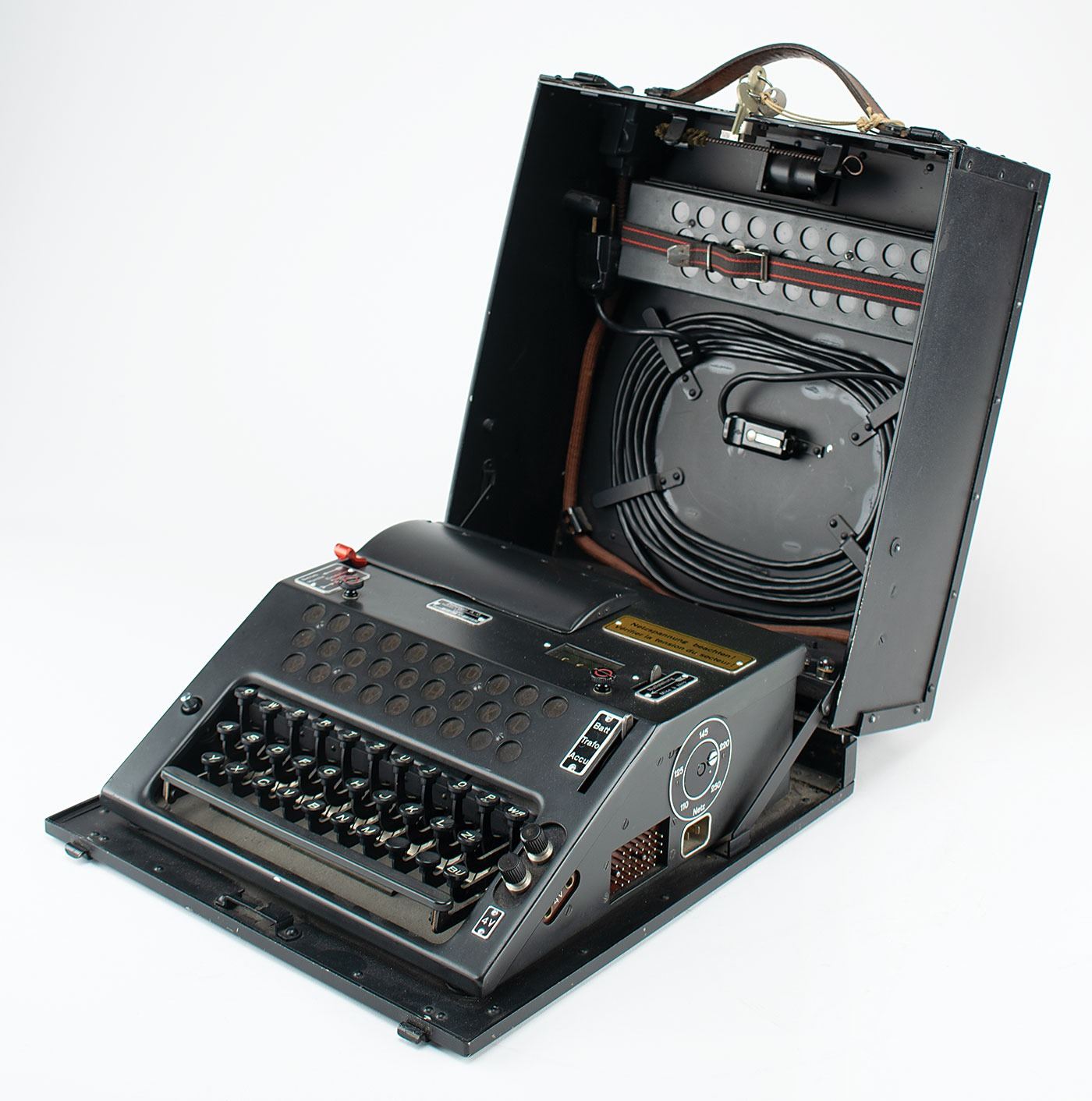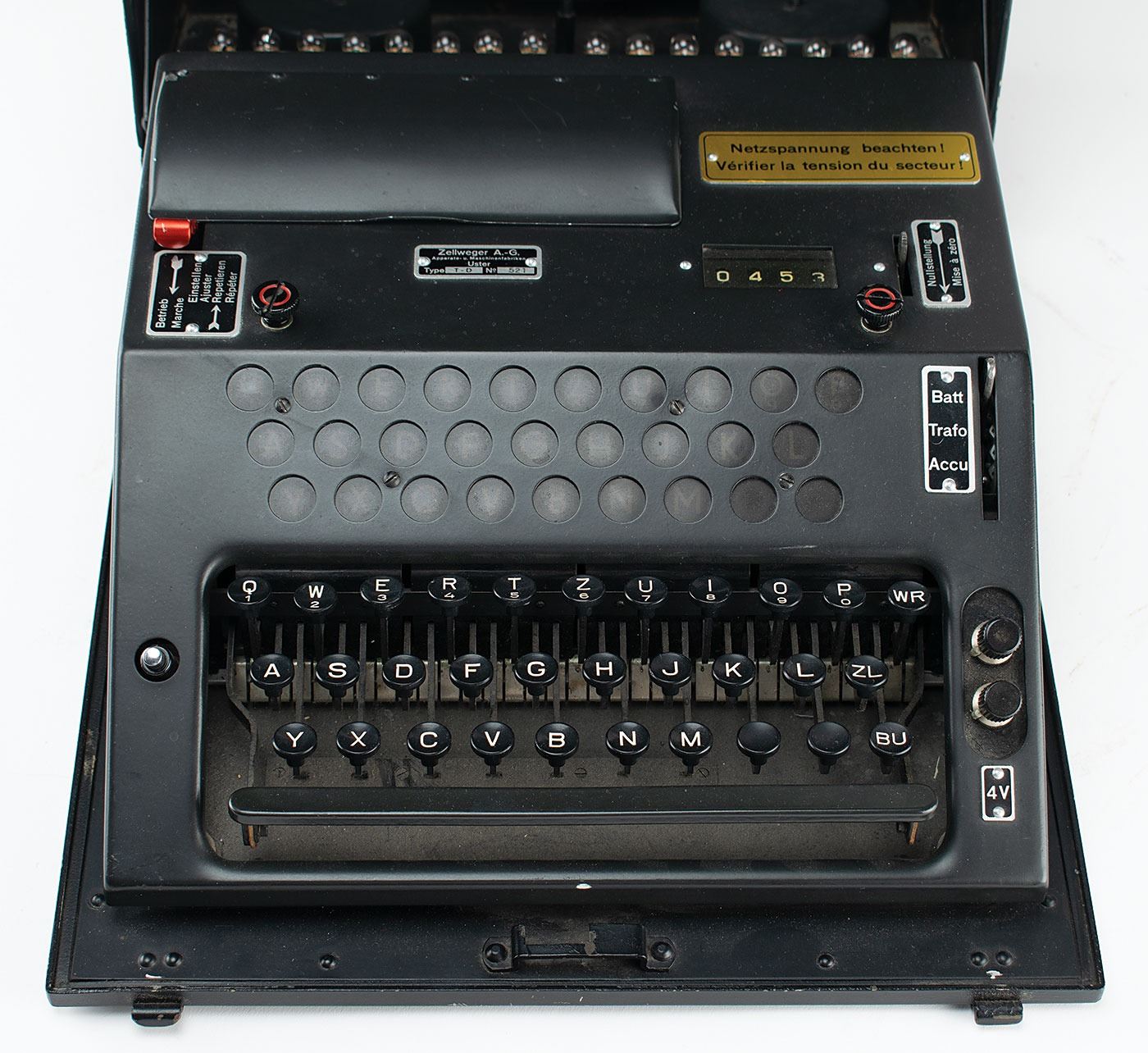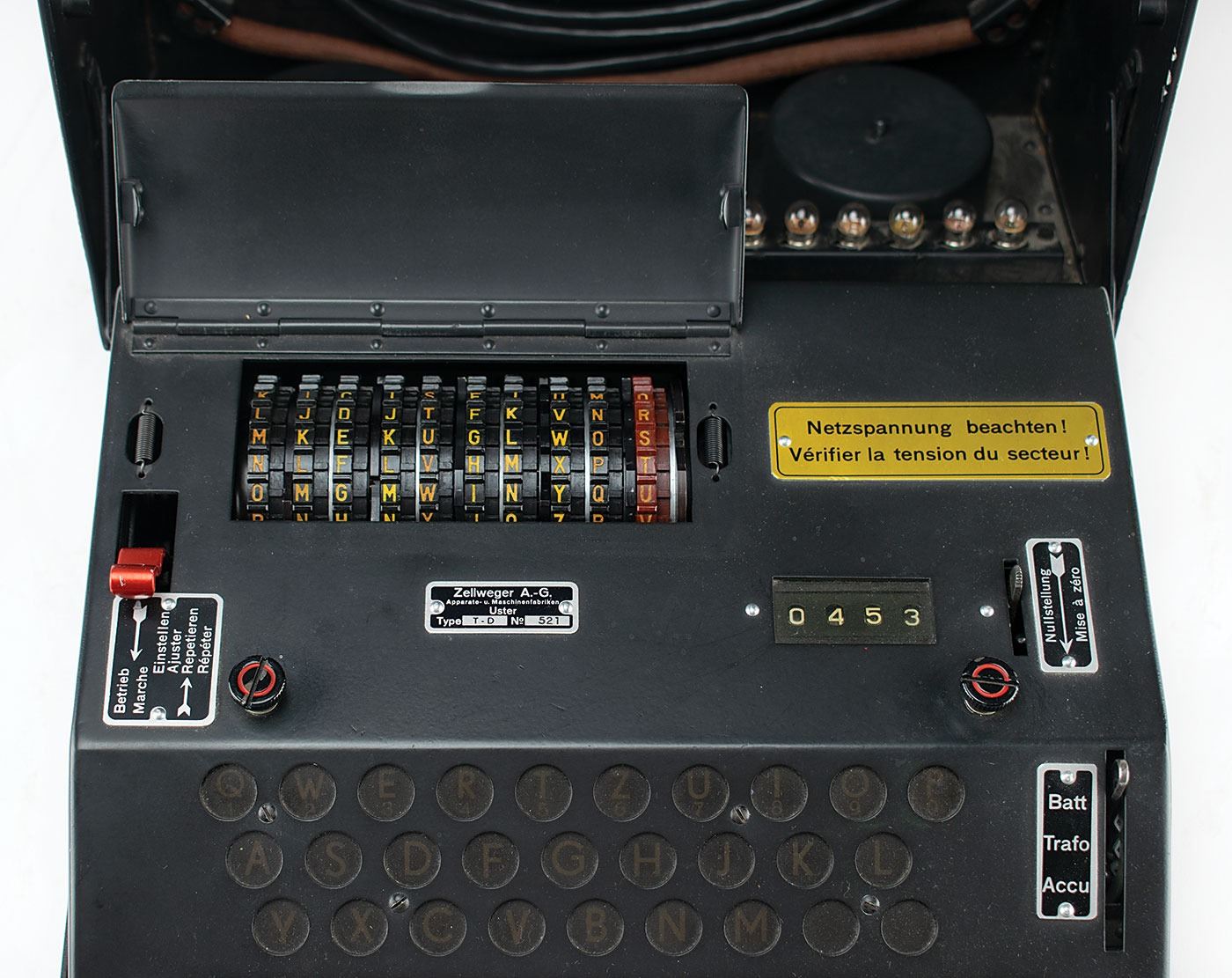 Complete and original wartime Swiss NEMA Model 45 cipher machine, serial no. TD-521, developed by Zellweger AG in Uster, Switzerland, during World War II as a replacement for the German Enigma Model K that was being used by the Swiss Army. The machine is also known as T-D, which stands for Tasten-Drücker Maschine (key-press machine).