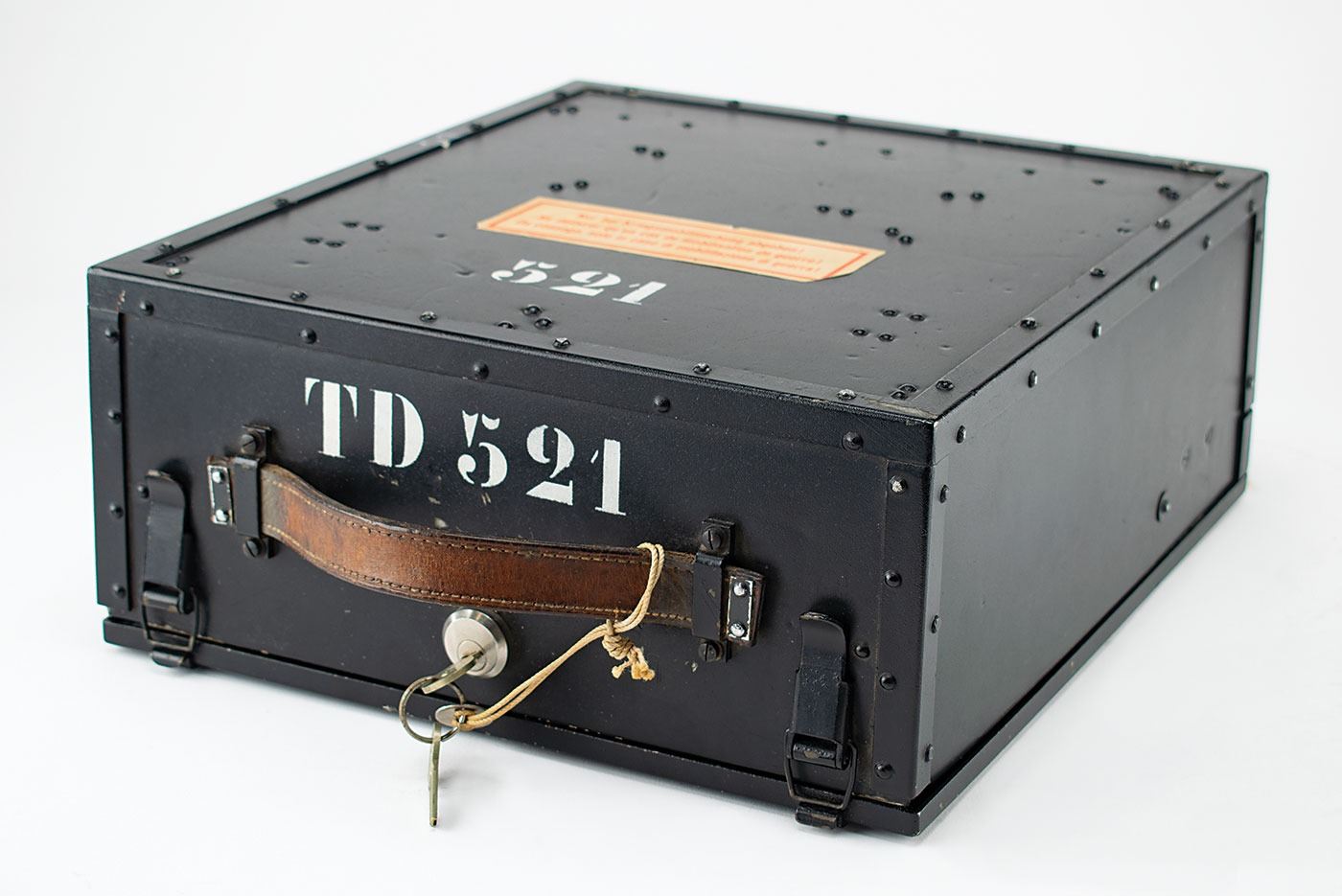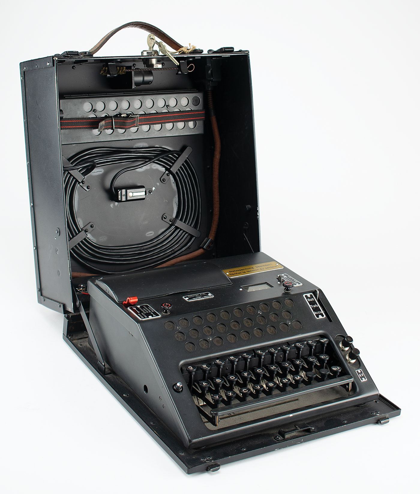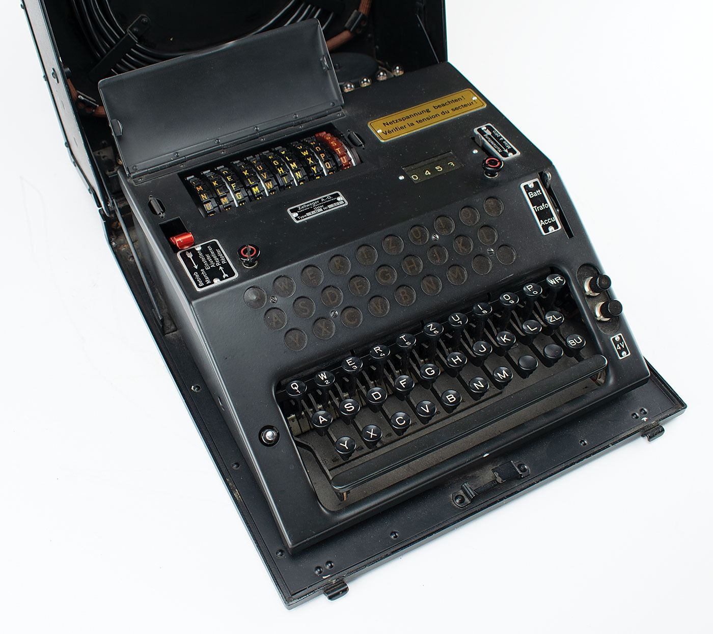 Complete and original wartime Swiss NEMA Model 45 cipher machine, serial no. TD-521, developed by Zellweger AG in Uster, Switzerland, during World War II as a replacement for the German Enigma Model K that was being used by the Swiss Army. The machine is also known as T-D, which stands for Tasten-Drücker Maschine (key-press machine).