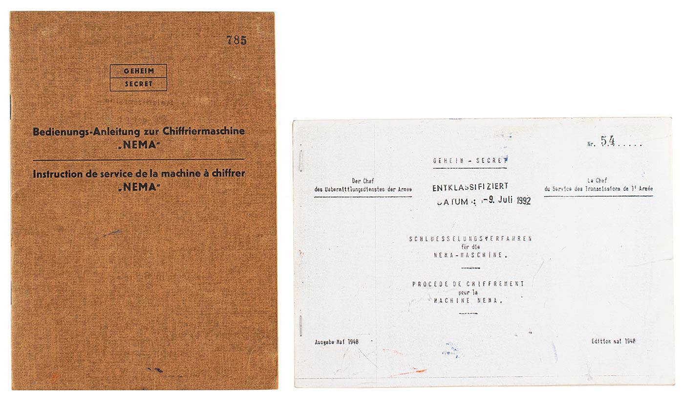 The NEMA cipher machine was developed between 1941 and 1943, and the first prototype was ready in early 1944. After a few modifications and improvements, the machine was finally approved in March 1945. Production started in 1946, with the first machines entering service in 1947. The NEMA was used by the Swiss Army in the years following WWII, and by the Swiss Diplomatic Service. The NEMA was officially declassified in 1992. Accompanied by two copies of manuals.