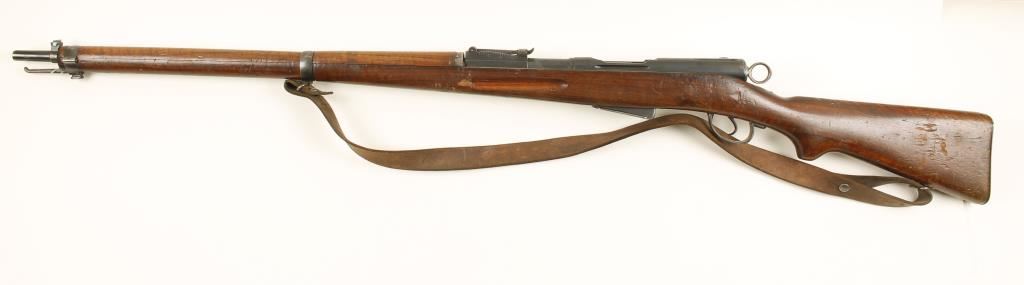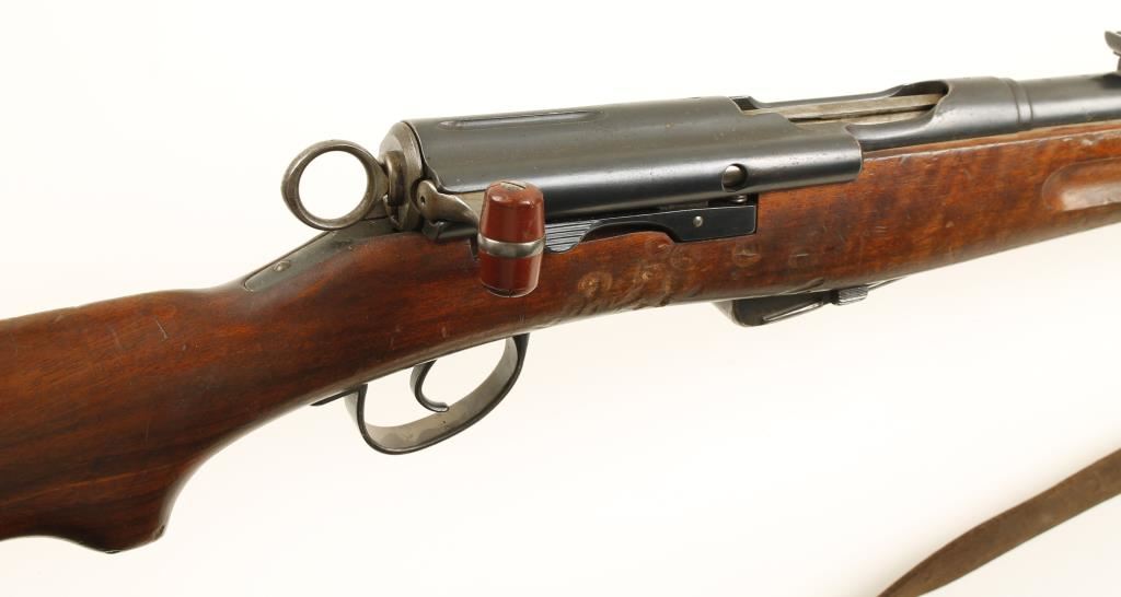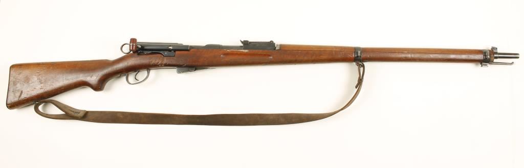 Blued military bolt-action rifle with a 30.7" barrel and one magazine. Bluing has edge wear and some scratches. Butt plate is almost bare metal with some surface rust. Wood is marked with the Swiss cross and is well battered. Forend and hand guard are loose on the barrel. Bore is shiny with good rifling. Action is fine. Condition is fair to good. *Modern Firearm*