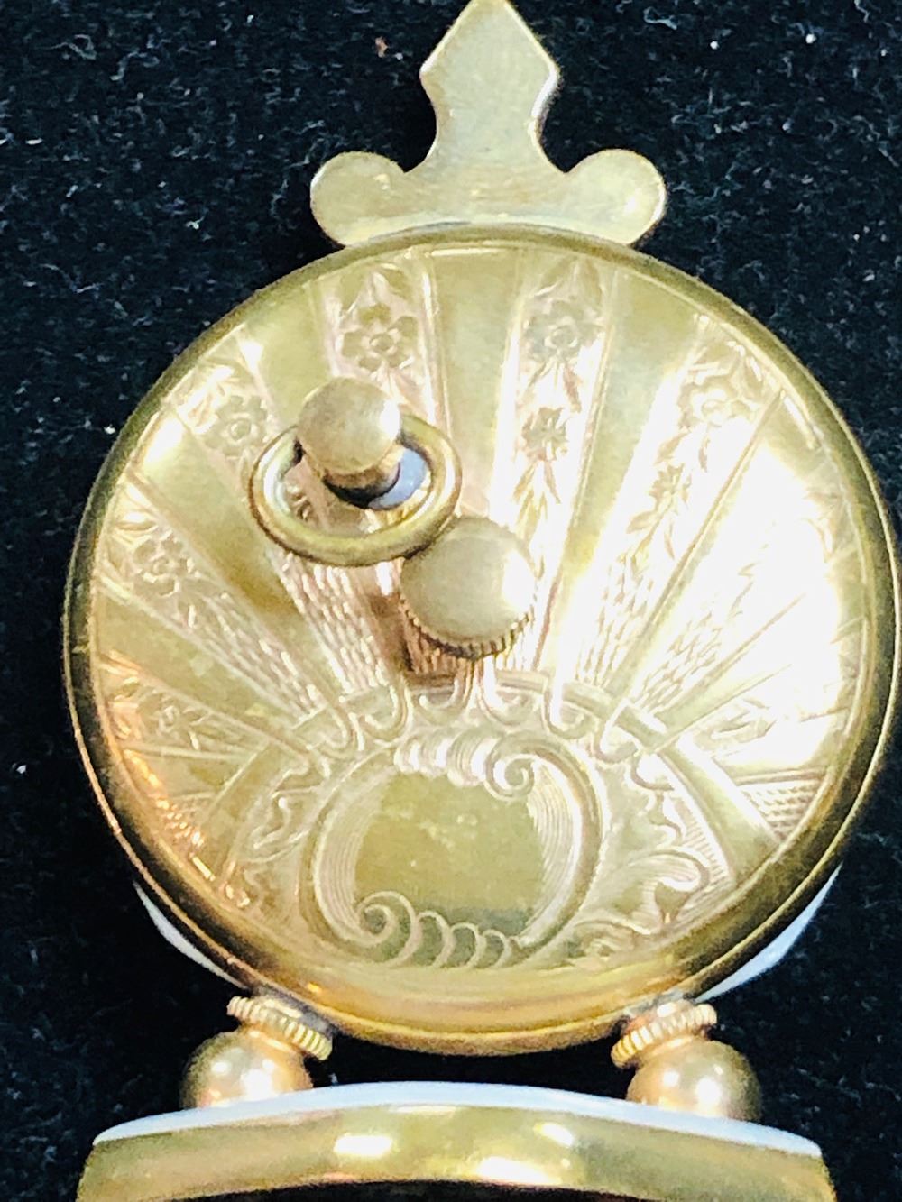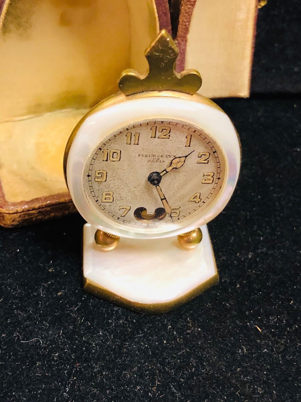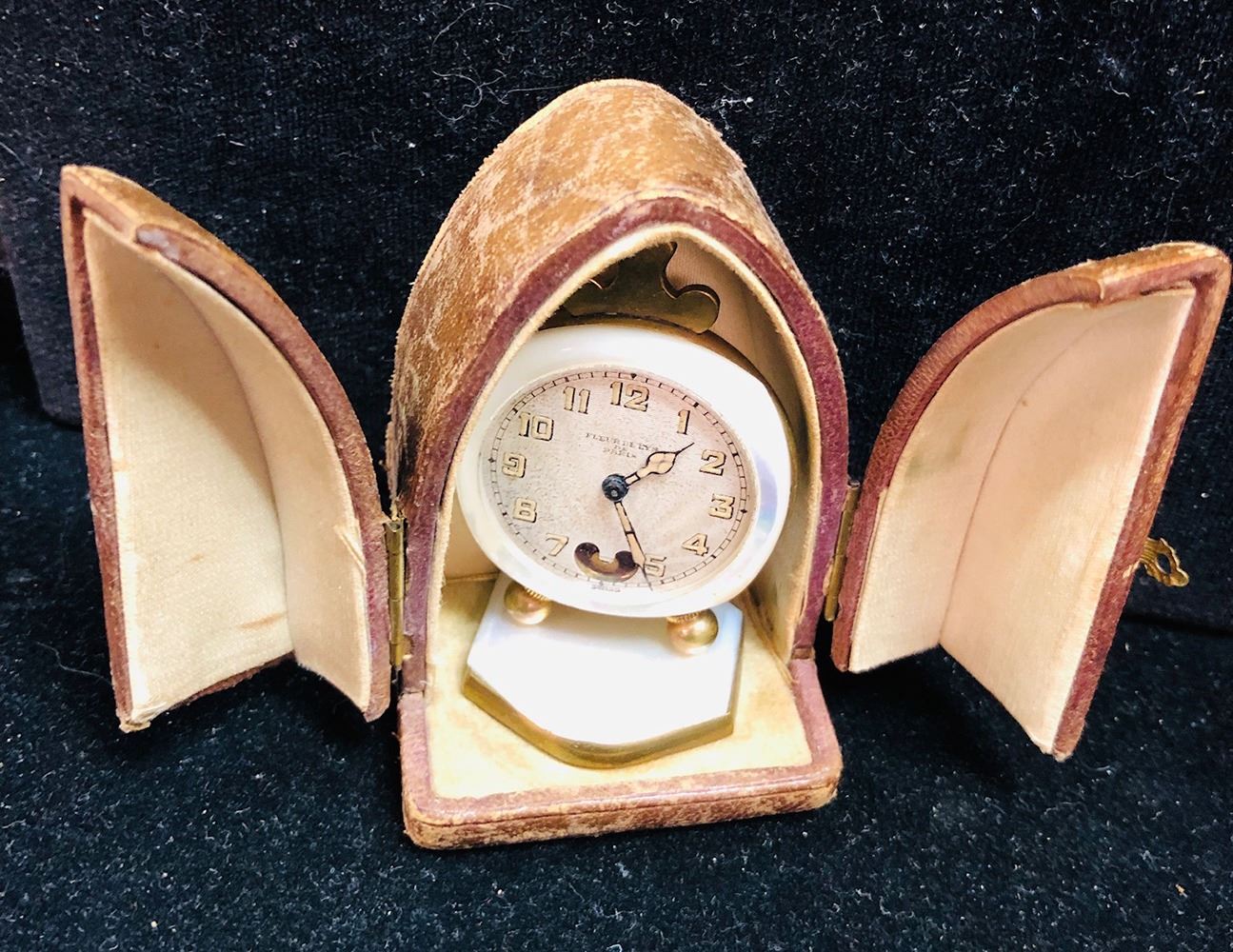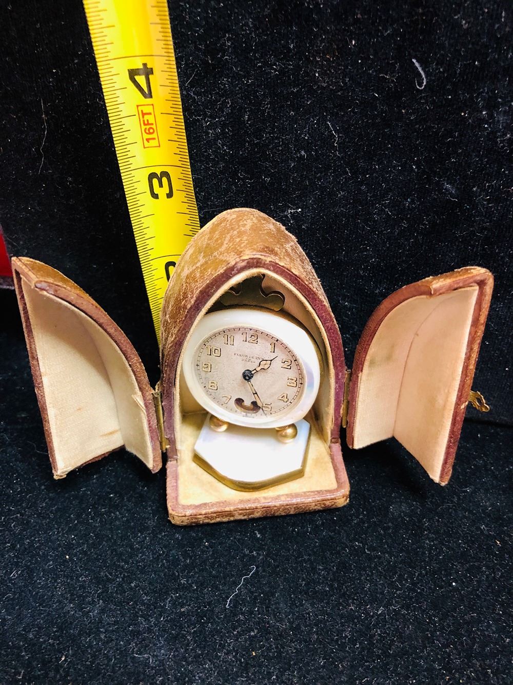 Swiss Tick Tock Clock in fitted case, Lenox W. Co., Swiss, Fleur De Lys de Paris on dial, all original with original pendulum, measures approx. 3” tall.
