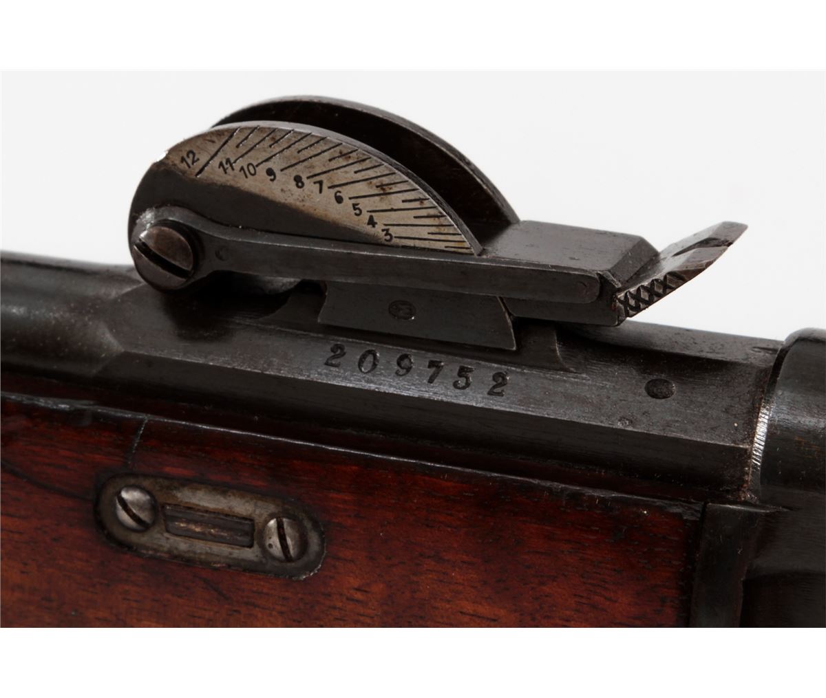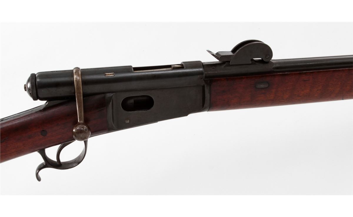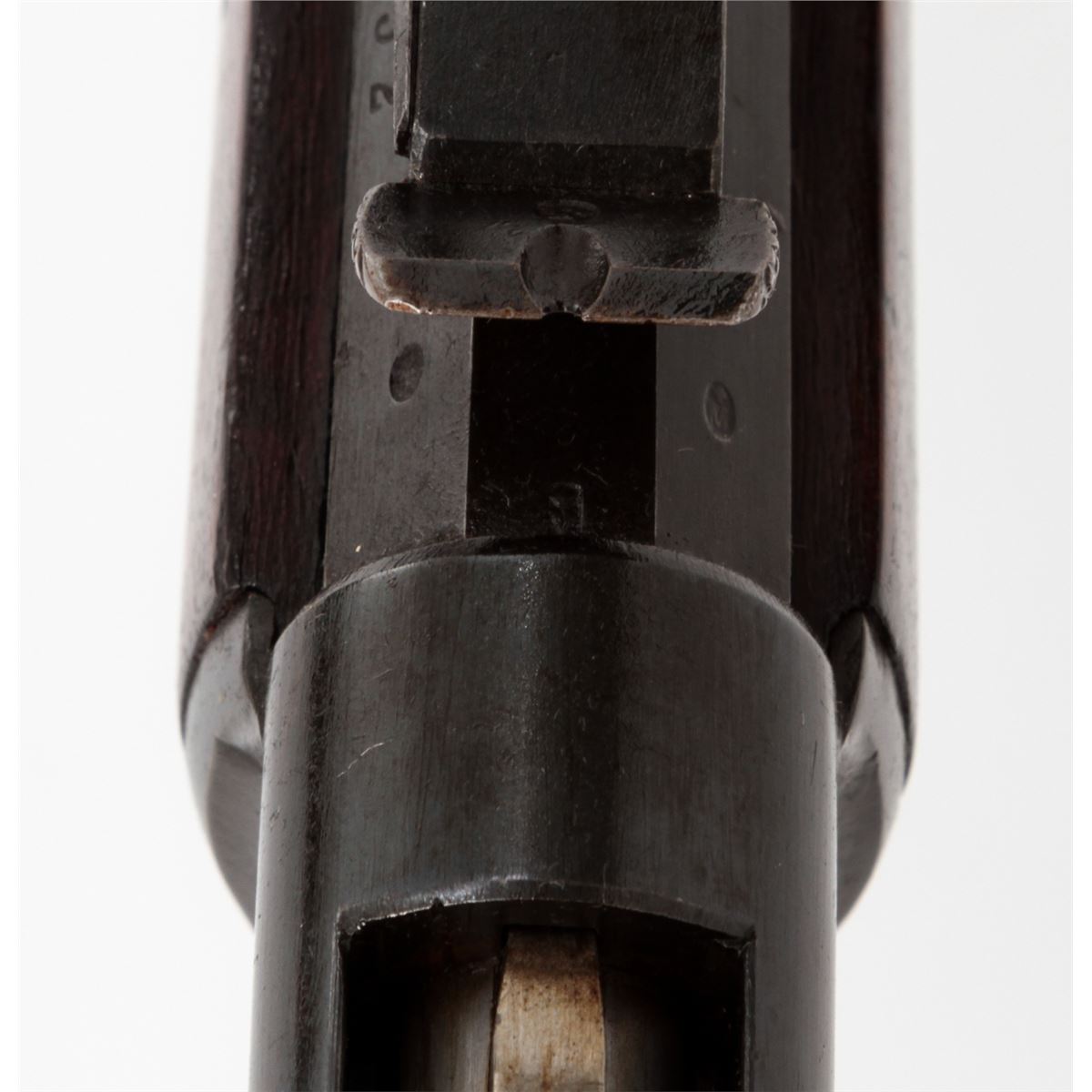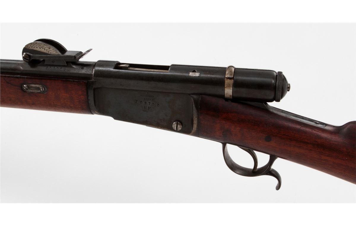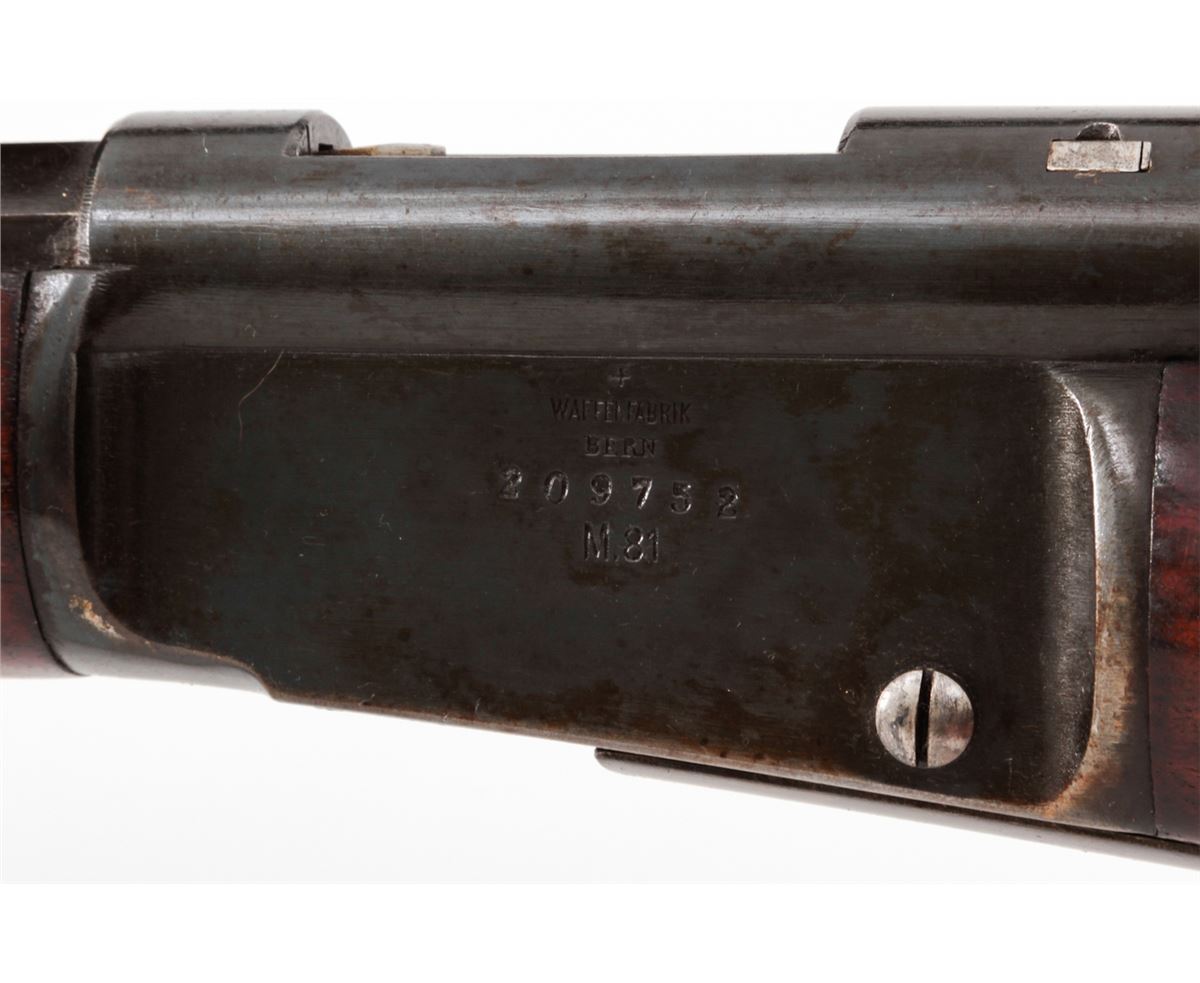 Swiss Vetterli M81 Bolt Action Rifle, #209752, .41 Swiss cal., 33'' barrel, blue finish, cartouched walnut stock and full-length forend. Rear sight calibrated to 1200 yards. Condition is about fine retaining approx. 92% original blue with lots of dried preservative to interior and exterior surfaces. Stock with just light to moderate scuffs and scratches and some oil darkening to top edge. Stock with arsenal repair at wrist. Good action, fair bore. Est.: $400-$600. (Antique)