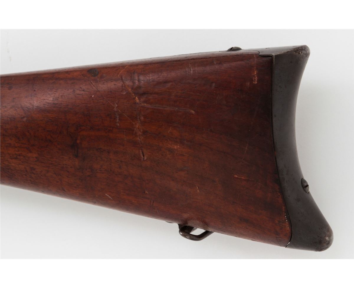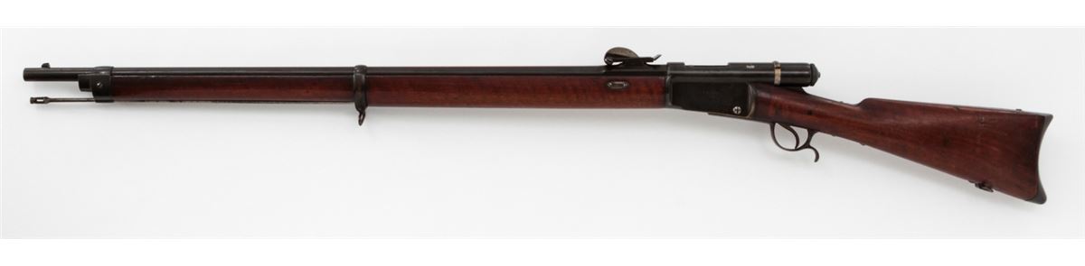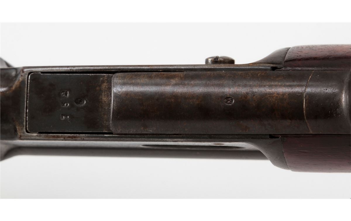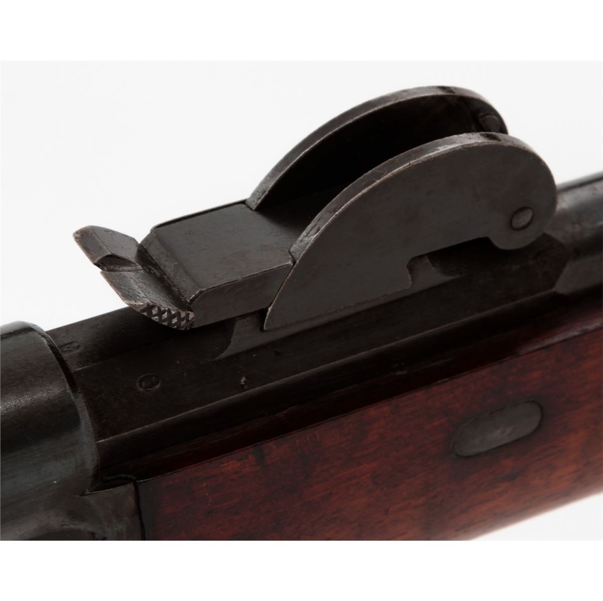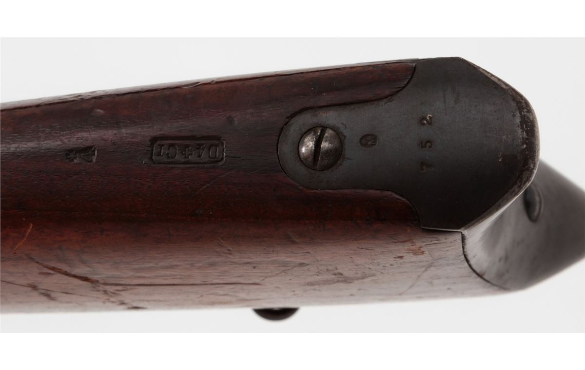 Swiss Vetterli M81 Bolt Action Rifle, #209752, .41 Swiss cal., 33'' barrel, blue finish, cartouched walnut stock and full-length forend. Rear sight calibrated to 1200 yards. Condition is about fine retaining approx. 92% original blue with lots of dried preservative to interior and exterior surfaces. Stock with just light to moderate scuffs and scratches and some oil darkening to top edge. Stock with arsenal repair at wrist. Good action, fair bore. Est.: $400-$600. (Antique)