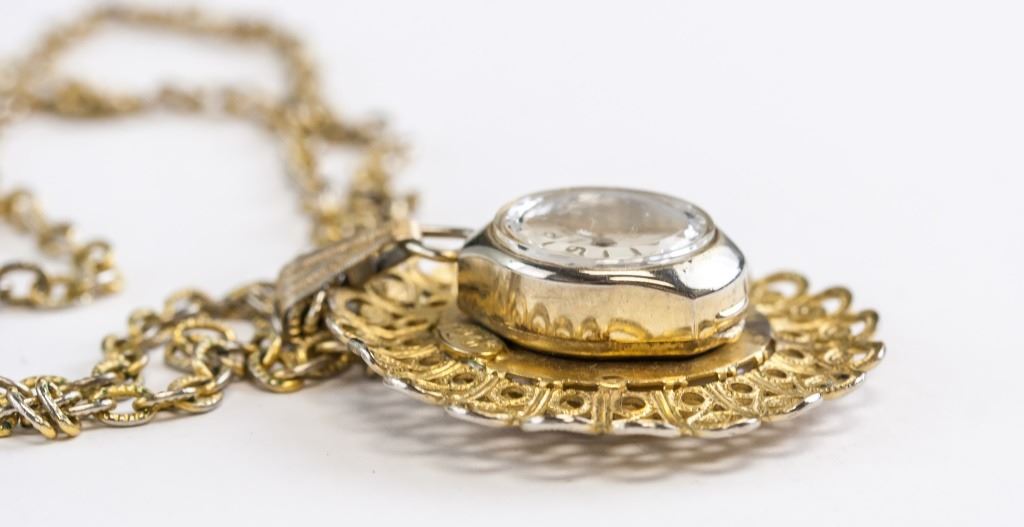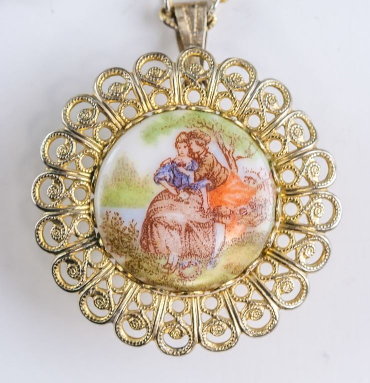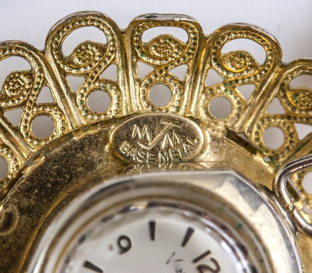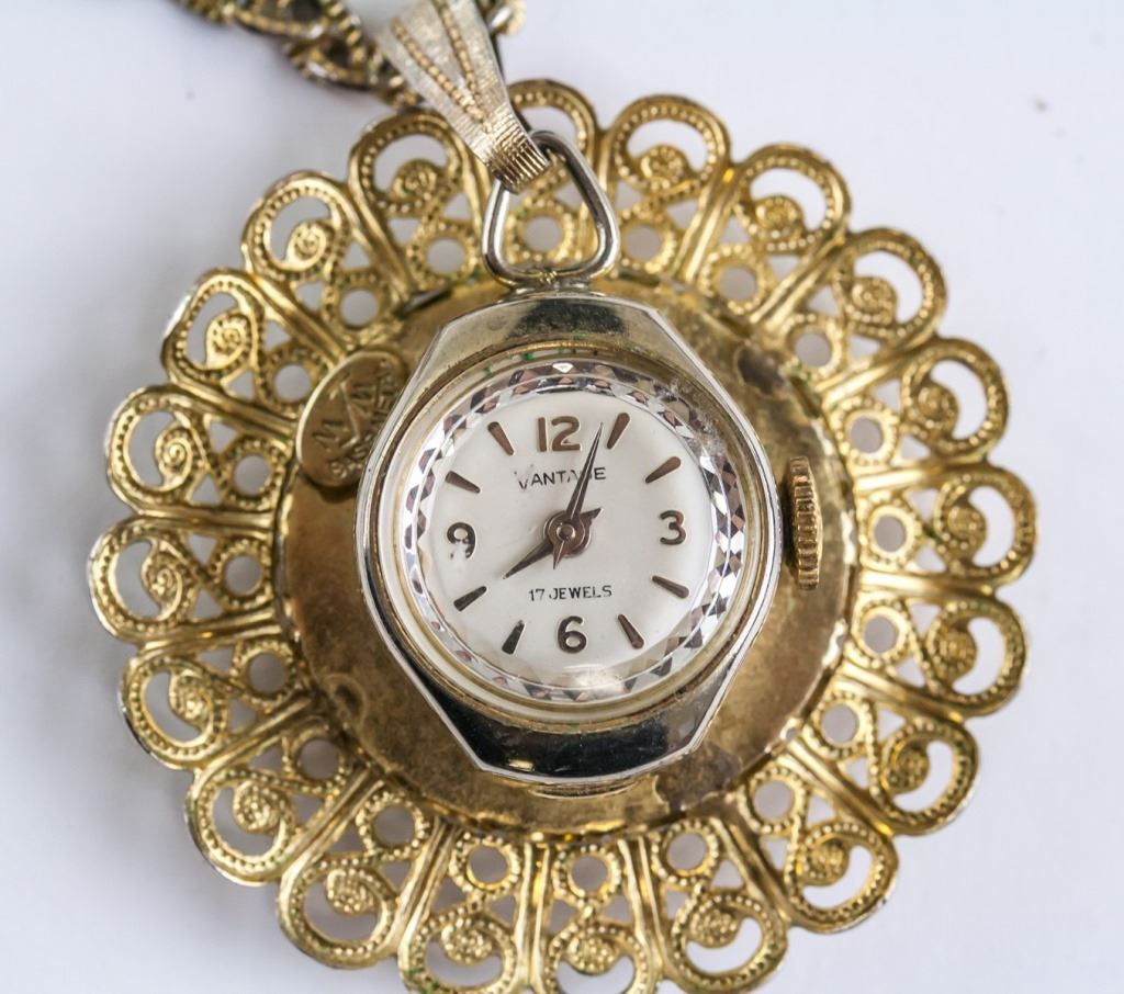 Pocket watch. "VANTAGE / 17 JEWELS" printed on watch face. "M/M BASE METAL" impressed in metal above watch. Painted couple on reverse of pocket watch. Diameter: 3.5 cm. 21 grams.