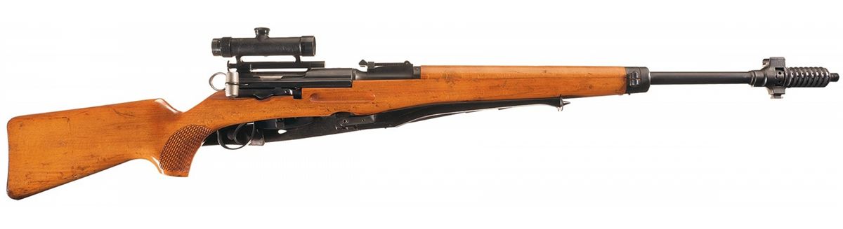 Introduced in the mid-1950s, the ZFK31/55 is a derivative of the K31 rifle configured for precision shooting with many of the parts changed towards that end. Approximately 4,150 were made with some being recently being imported into the United States. This model has a heavily reinforced blade front sight with integral flash hider/bayonet lug, with a tangent rear sight marked 1-15. These rifles feature a straight pull type action with the chamber area marked with the standard Swiss Cross inside a Shield. This model has the integral scope mounting points with the 3.5 sniper scope attached. The top of the scope body is marked "Kern Aarau/V=3.5x75" over 4245. These rifles were all fitted with a beech stock and handguard with a checkered pistol grip area with a sheet metal buttplate. The stock has a front folding sheet metal bipod and side mounted leather sling. This rifle includes a green painted metal belt carrier numbered to match the scope and one box magazine that is marked "Zf.Kar". The underside of the barrel is dot-matrix marked "ZFK31/55 SWISS 7.5MMX.55 OOW INC. CHARDON OH."