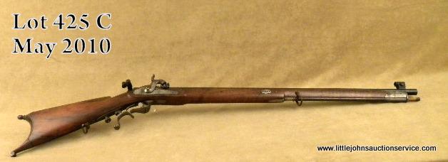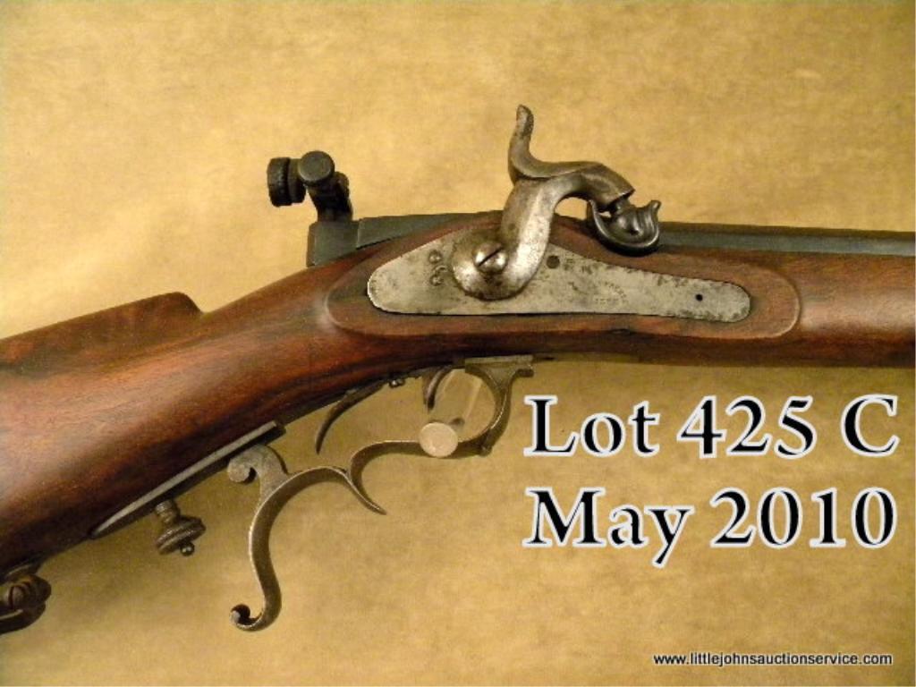 Swiss federal Schuetzen percussion target rifle, .45 cal., 32” barrel, re-blued finish to barrel that was added after the stock and action was likely brought home after WW II by a returning G.I., adjustable rear sight, hooded front sight,double set triggers, iron Swiss butt plate, deluxe grained wood stock with brass tipped cleaning rod. This gun is in overall good condition showing the majority of the re-blue on the barrel, fair bore, crisp action and double set triggersworking at time of description; scattered spots of erosion on lock plate, wood stock has beautiful graining with some repaired cracks on both sides of the stock at the location of the front sling swivel. Est.: $350-$700.