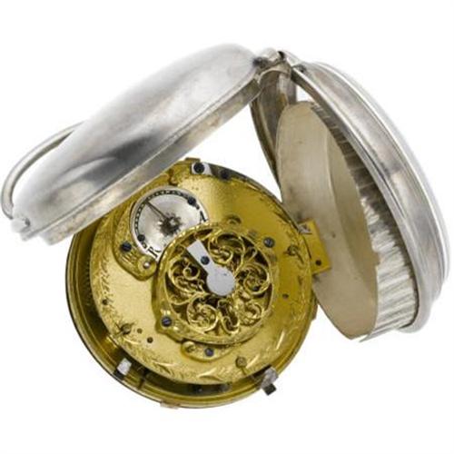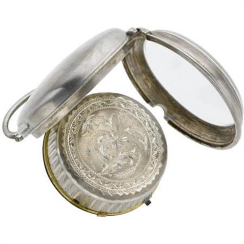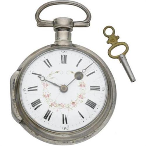 <B>Swiss Fancy Dial Verge Fusee, circa 1800</B></I> Large, heavy silver case with box style hinge, inner fancy engraved flip open dust cap. Porcelain dial with pink and green flowers, raised Roman numerals, moon hand. Very nice gilt fusee movement, pierced two footed cock, leaf engravings on the perimeter, baluster pillars.<BR><BR><b>Shipping:</b> Miscellaneous Collectibles, Smal (<a target="_blank" href="http://www.heritageauctions.com/common/shipping.php">view shipping information</a>)