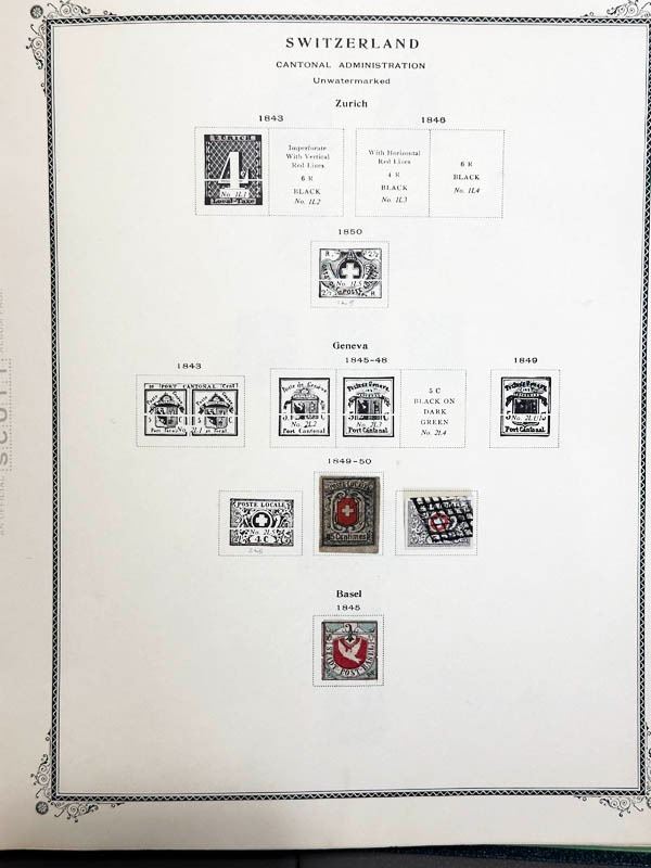 Switzerland, 1850-1980, an old-time used collection with high catalog value. Mounted in Scott a specialty album, very nearly complete in the regular issues from 1850-1975 and is especially strong in the 19th century issues; also some very nice later items such as #293-305, fair semi-postals, airmails very near complete and spotty postage dues and officials. The 19th century alone cats about $27,000 (the few damaged or fakes have not been counted). This is a neat old-time collection that looks like it hasn't been touched in nearly 40 years! overall F-VF