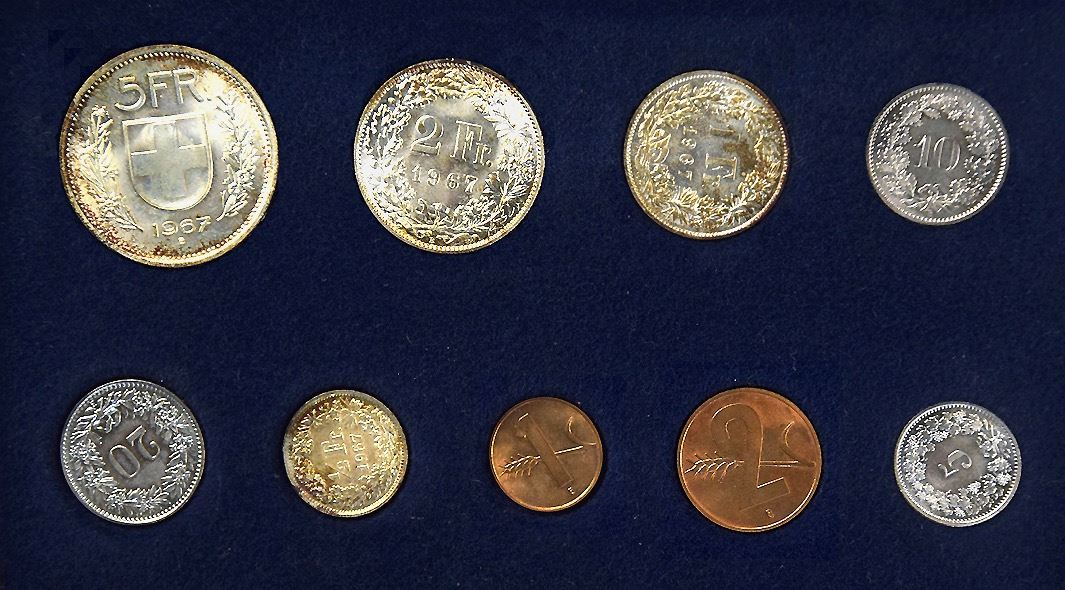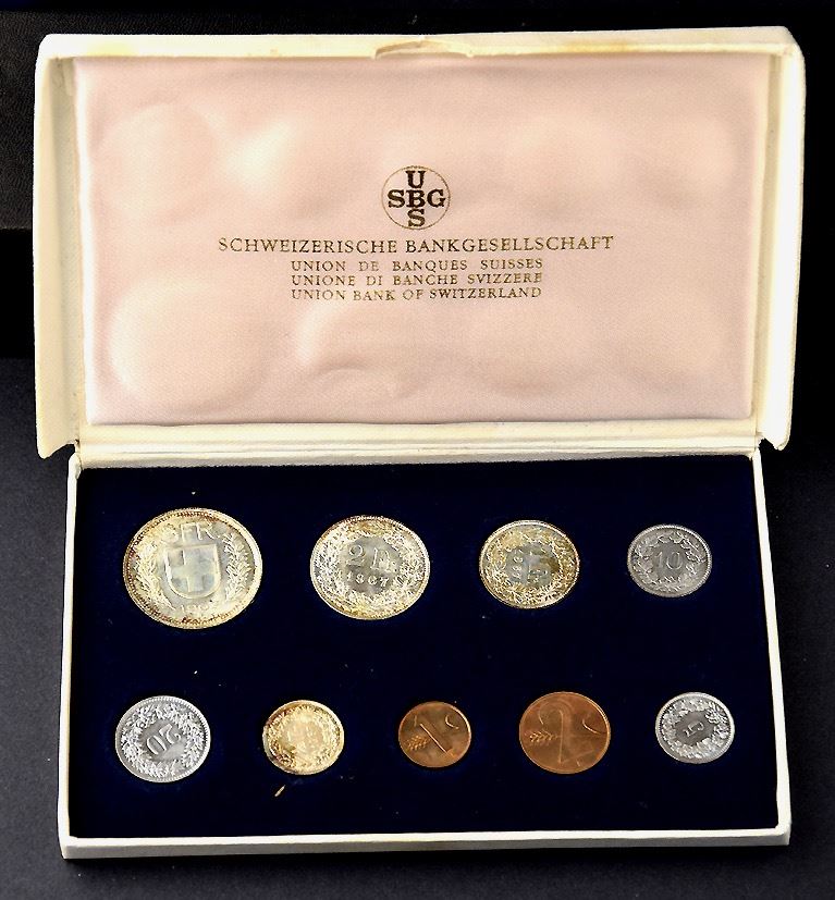 Switzerland, 1967 gem uncirculated 9 piece mint set. Issued by the Union Bank of Switzerland. In original velvet-lined cardboard case.