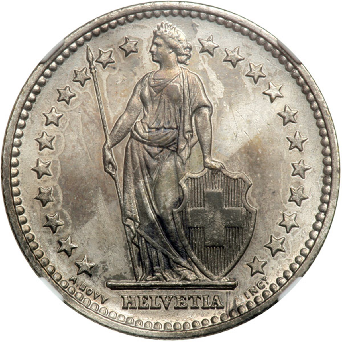 Switzerland. 2 Francs, 1886-B. KM-21; D.T. 304. Value in Money Trend's is 200 Euros in extremely fine and 2760 Euros in Uncirculated. Toned. NGC graded About Uncirculated, Details (Surface Hairlines).