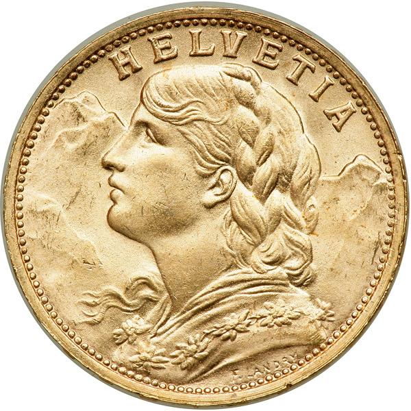 Switzerland. 20 Francs, 1947-B. Fr-499; KM-35.2. Weight 0.1867 ounce. Girl head against Alps. Brilliant Uncirculated.