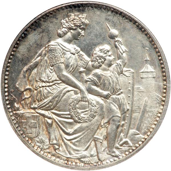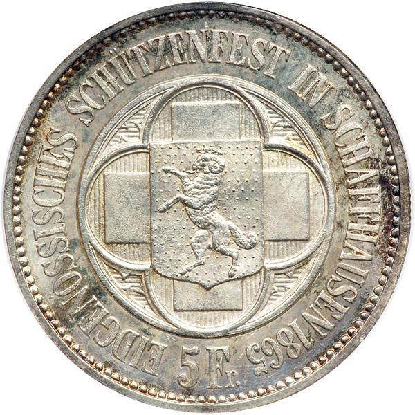 Switzerland. 5 Francs, 1865. Dav-382; KM-S8. For the Federal Shooting Festival at Schaffhausen. NGC graded MS-64.