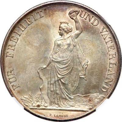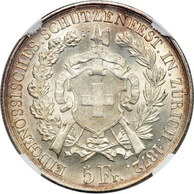 Switzerland. 5 Francs, 1872. Dav-385; KM-S11. For the Federal Shooting Festival at Zurich. NGC graded AU-58.