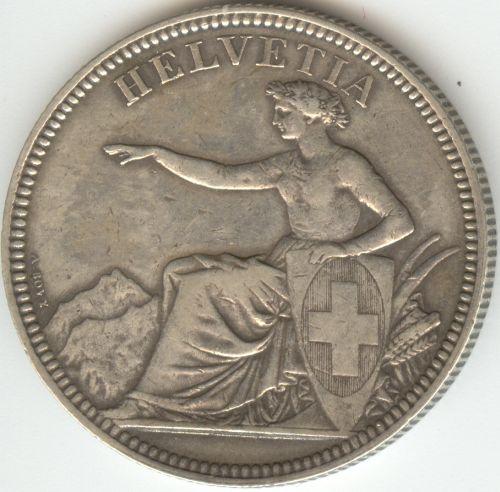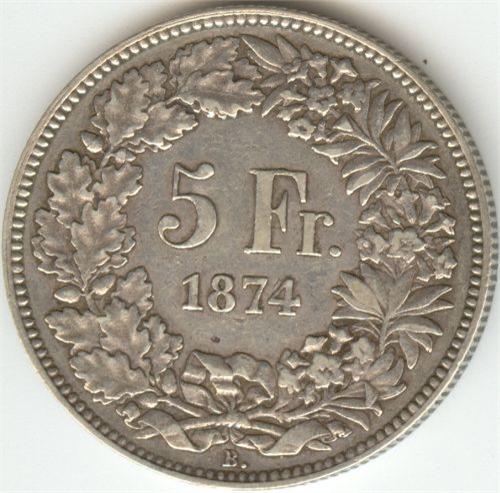 Switzerland 5 Francs 1874 B. ( Brussels ) in EF-40, scarce coin. KM # 11.