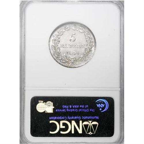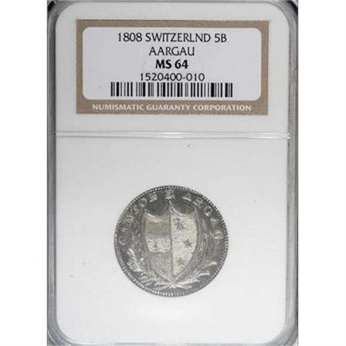 <B>Aargau. 5 Batzen 1808,</B></I> KM-13.1, MS64 NGC, sharp strike except for a few small details, very choice and somewhat prooflike with most pleasing, bright silvery gray surfaces. Obverse design features the flag of this canton (immediately west of Zurich), which freed itself from French occupation and joined the Swiss confederation in 1803, just five years prior to this coin's creation. A delightful piece.<BR><BR><b>Shipping:</b> Coins & Currency (<a target="_blank" href="http://www.heritageauctions.com/common/shipping.php">view shipping information</a>)