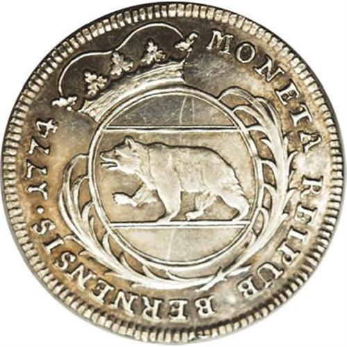 <B>Bern. Quarter Taler 1774,</B></I> KM-118, prooflike AU-Unc., sharp details and superb but for an unfortunate light scratch through the bear, glittering mirror fields, hint of silvery gold iridescence, marvelous edge design.<BR><BR><b>Shipping:</b> Coins & Currency (<a target="_blank" href="http://www.heritageauctions.com/common/shipping.php">view shipping information</a>)