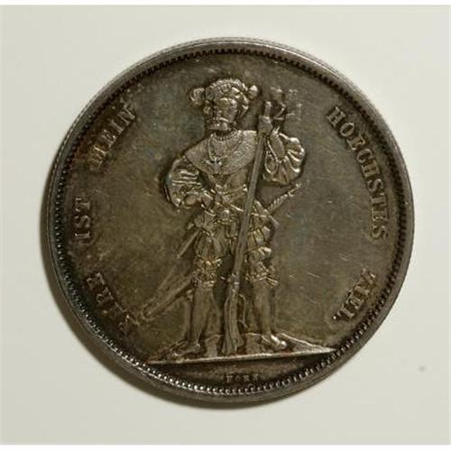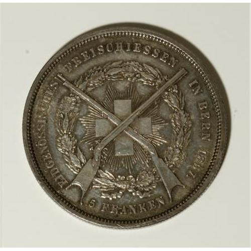<B>Bern. Silver Shooting Taler or 5 Francs 1857,</B></I> KM-S4, sharp toned AU, light pinscratch.<BR><BR><b>Shipping:</b> Coins & Currency (<a target="_blank" href="http://www.heritageauctions.com/common/shipping.php">view shipping information</a>)