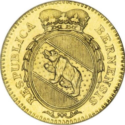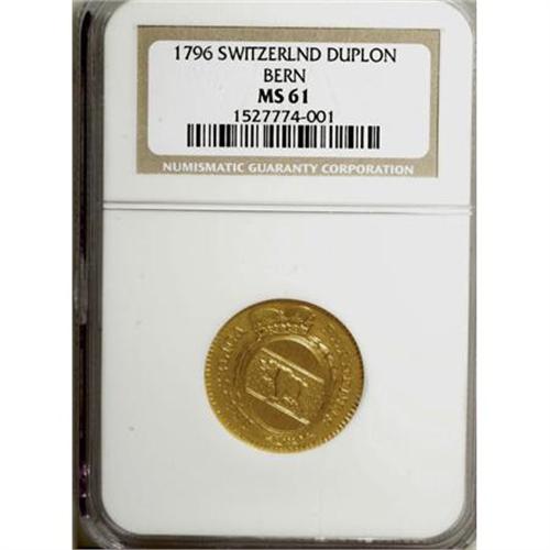<B>Bern gold Duplone 1796,</B></I> KM-152, MS61 NGC, old-gold color, a few softly struck areas.<BR><BR><b>Shipping:</b> Coins & Currency (<a target="_blank" href="http://www.heritageauctions.com/common/shipping.php">view shipping information</a>)