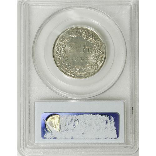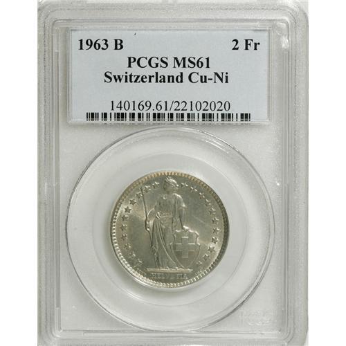 <B>Confederation. 2 Francs 1963-B,</B></I> KM-21 <I>but struck in copper-nickel,</B></I> not silver. MS61 PCGS, an odd grade because it has no problems but just lacks luster, which is to be expected perhaps for a nickel-alloy coin. Made 5 years before Switzerland changed from silver to this metal for its coinage. Must be extremely rare. Our estimate is a sheer guess. Bid as you will.<BR><BR><b>Shipping:</b> Coins & Currency (<a target="_blank" href="http://www.heritageauctions.com/common/shipping.php">view shipping information</a>)