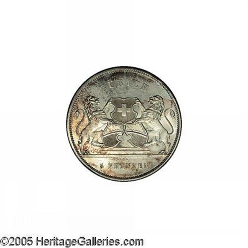 <B>Confederation 5 Francs 1859 Zurich Shooting Fest, </B></I>KM-S5, choice toned UNC, an original mint state example!