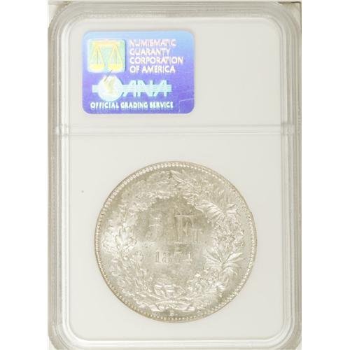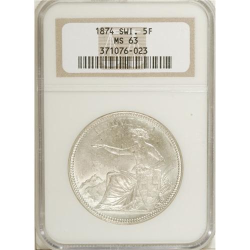 <B>Confederation. 5 Francs 1874-B,</B></I> KM-11, MS63 NGC, lots of tiny marks and a scuff or two but silvery white and frosty with luster. Last year of this short-lived, classic type.<BR><BR><b>Shipping:</b> Coins & Currency (<a target="_blank" href="http://www.heritageauctions.com/common/shipping.php">view shipping information</a>)