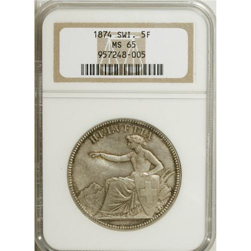 <B>Confederation. 5 Francs 1874-B,</B></I> KM-11, MS65 NGC, tiny abrasions under well-set golden gray iridescent toning.<BR><BR><b>Shipping:</b> Coins & Currency (<a target="_blank" href="http://www.heritageauctions.com/common/shipping.php">view shipping information</a>)