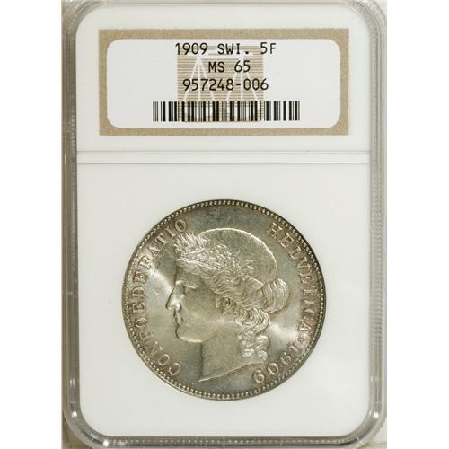 <B>Confederation. 5 Francs 1909-B,</B></I> KM-34, MS65 NGC, a beautifully balanced Gem Uncirculated coin, strong silvery cartwheel luster combined with a mere blush of golden hues, and almost no abrasions at all. Rare so fine.<BR><BR><b>Shipping:</b> Coins & Currency (<a target="_blank" href="http://www.heritageauctions.com/common/shipping.php">view shipping information</a>)