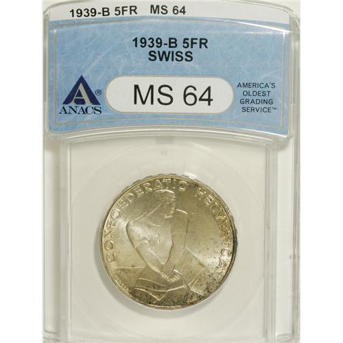 <B>Confederation. 5 Francs 1939-B,</B></I> KM-42, commemorative for the Battle of Laupen, MS64 ANACS, light gold toning, brilliant.<BR><BR><b>Shipping:</b> Coins & Currency (<a target="_blank" href="http://www.heritageauctions.com/common/shipping.php">view shipping information</a>)